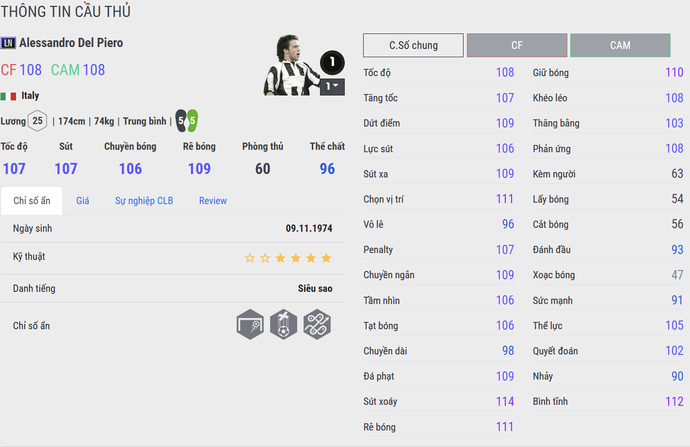 Del Piero là một trong những tiền đạo hộ công cực kì đa năng mà người chơi team color Juventus luôn ưu tiên sử dụng nhằm đem đến những hiệu quả thi đấu chất lượng. Del Piero không chỉ chơi tốt hộ công mà cả vị trí tiền vệ công lẫn chạy cánh đều đem lại giá trị hiệu quả.