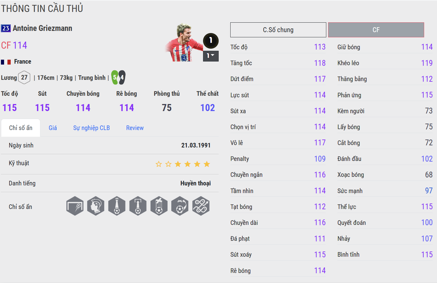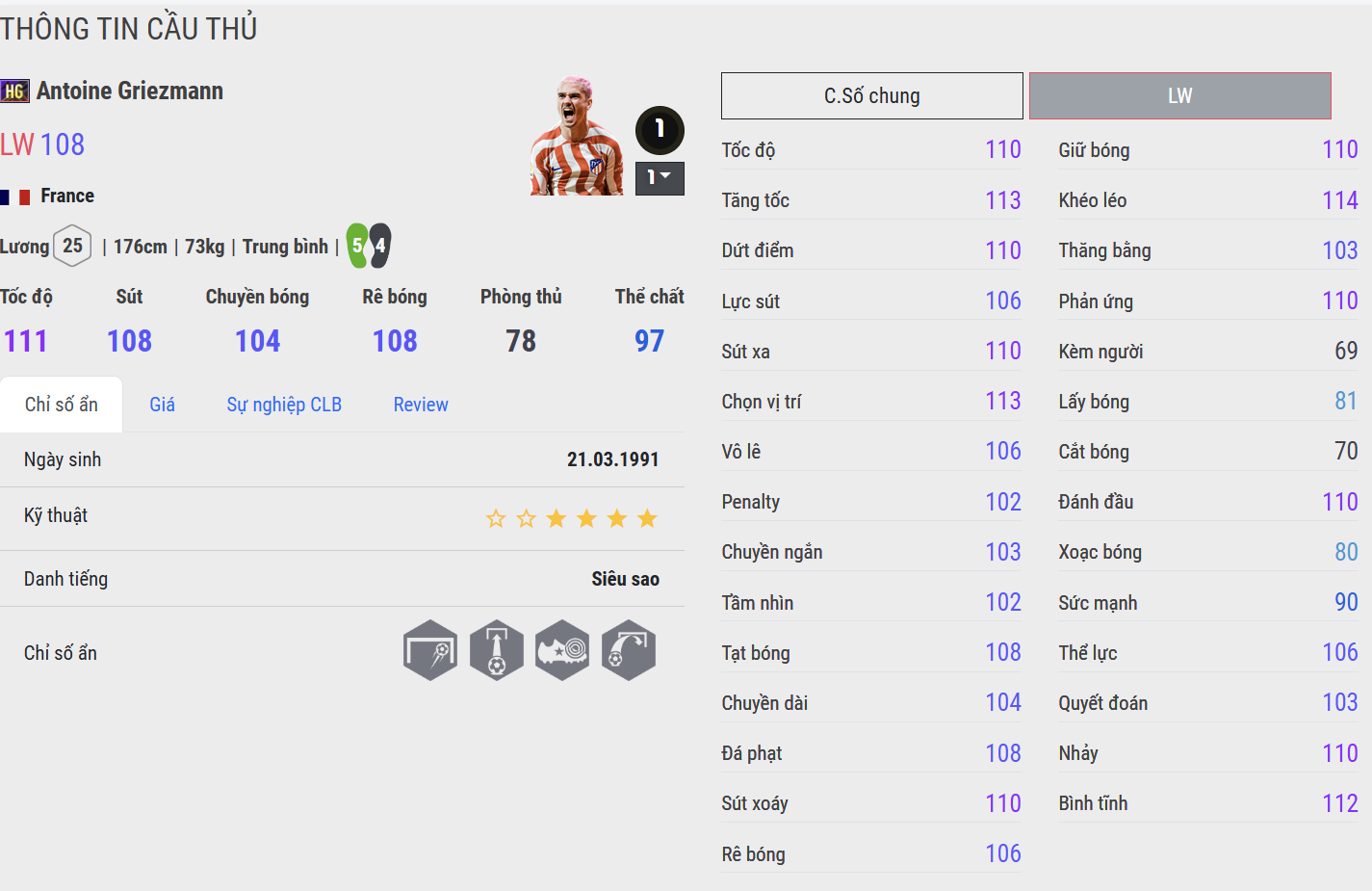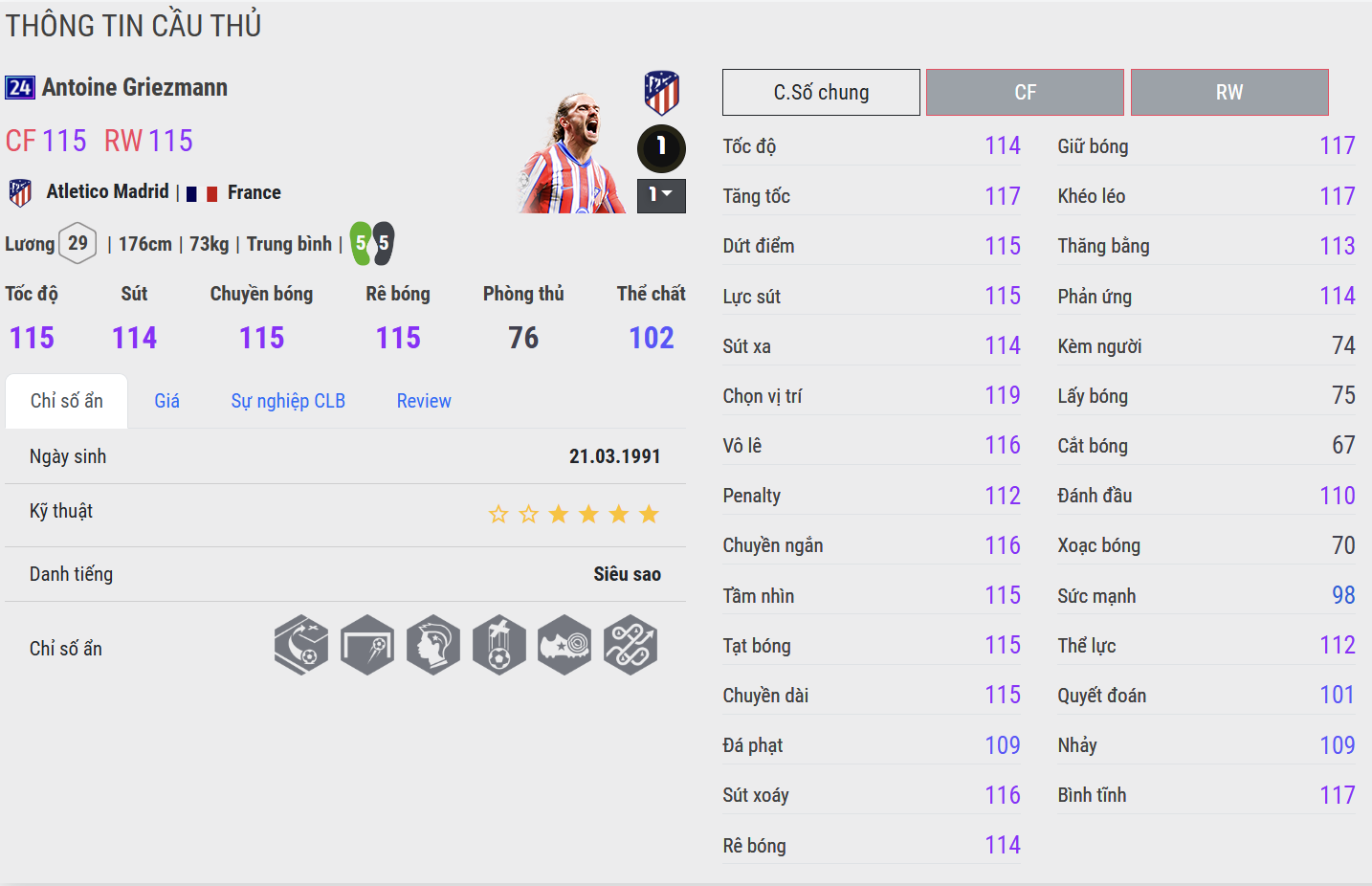 Griezmann còn sở hữu tốc độ khá, chuyền bóng tốt và khả năng không chiến ấn tượng, phù hợp với cả lối đá kiểm soát bóng lẫn phản công nhanh. Những mùa thẻ như 25TY, 24TS, 23UCL... đều có chỉ số cao, giúp anh trở thành lựa chọn lý tưởng cho hàng công trong FC Online.