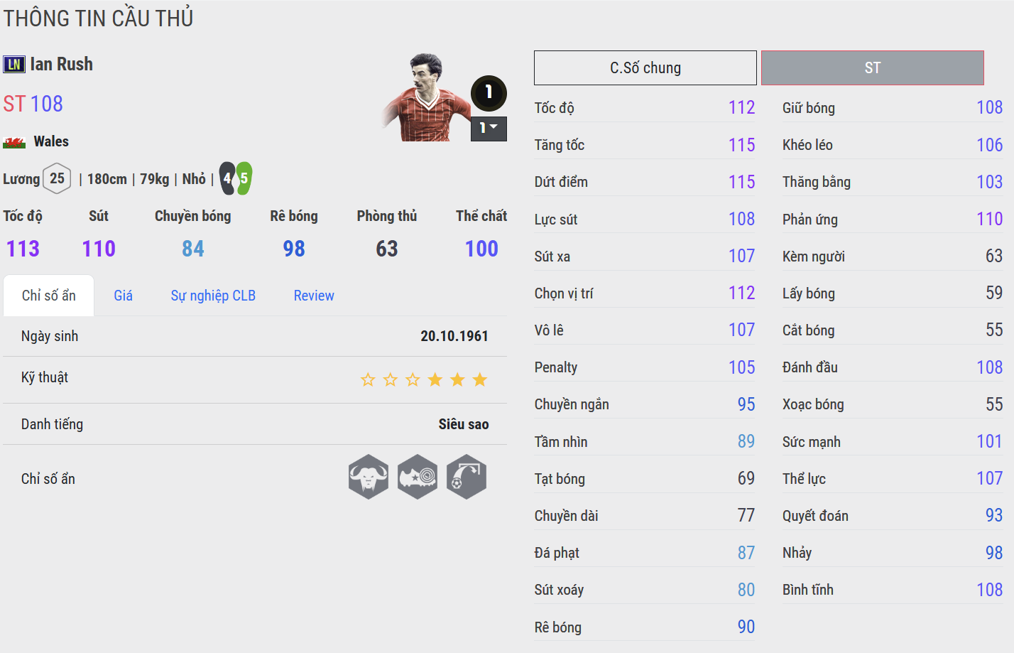 Ian Rush là huyền thoại của Liverpool và là một trong những tiền đạo xuất sắc nhất lịch sử bóng đá Anh. Ông nổi tiếng với bản năng săn bàn đáng sợ, tốc độ cùng khả năng chọn vị trí tuyệt vời.