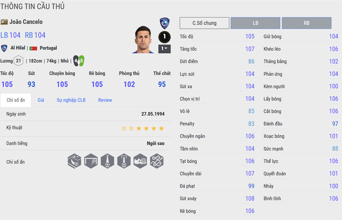 Không chỉ hỗ trợ phòng ngự chắc chắn, Cancelo còn thường xuyên tạo ra những tình huống dâng cao bất ngờ, góp phần mở ra thế trận. Dù không quá vượt trội về thể hình hay tranh chấp, nhưng nhờ AI tốt và cảm giác điều khiển mượt mà, Cancelo luôn là một trong những hậu vệ biên được tin dùng nhất trong các đội hình quốc dân hay chiến thuật pressing hiện đại trong FC Online.