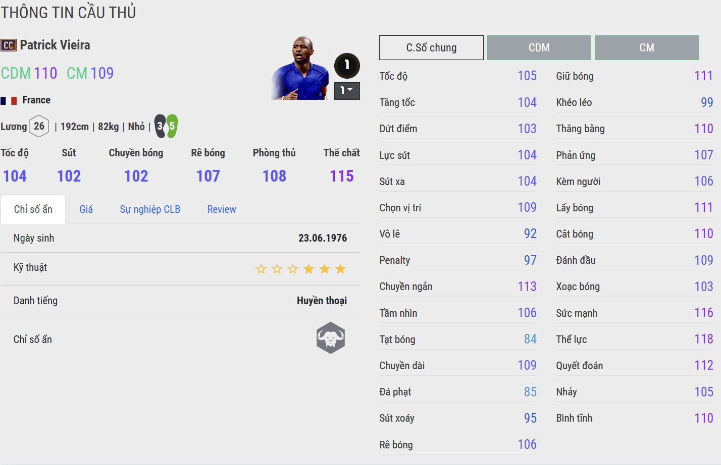 Patrick Vieira là một trong những tiền vệ trung tâm xuất sắc nhất lịch sử bóng đá Pháp và là biểu tượng bất diệt của Arsenal dưới triều đại Arsène Wenger. Sinh năm 1976, Vieira nổi bật với thể hình lý tưởng, khả năng tranh chấp mạnh mẽ cùng lối chơi thông minh và kỷ luật. Anh chính là “trái tim” nơi tuyến giữa của Arsenal trong giai đoạn đỉnh cao, đặc biệt góp công lớn trong mùa giải bất bại 2003/04 huyền thoại.