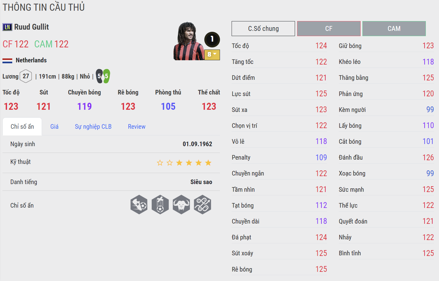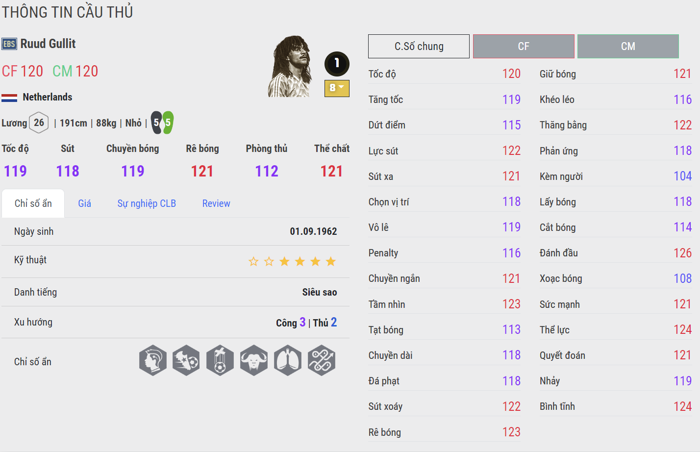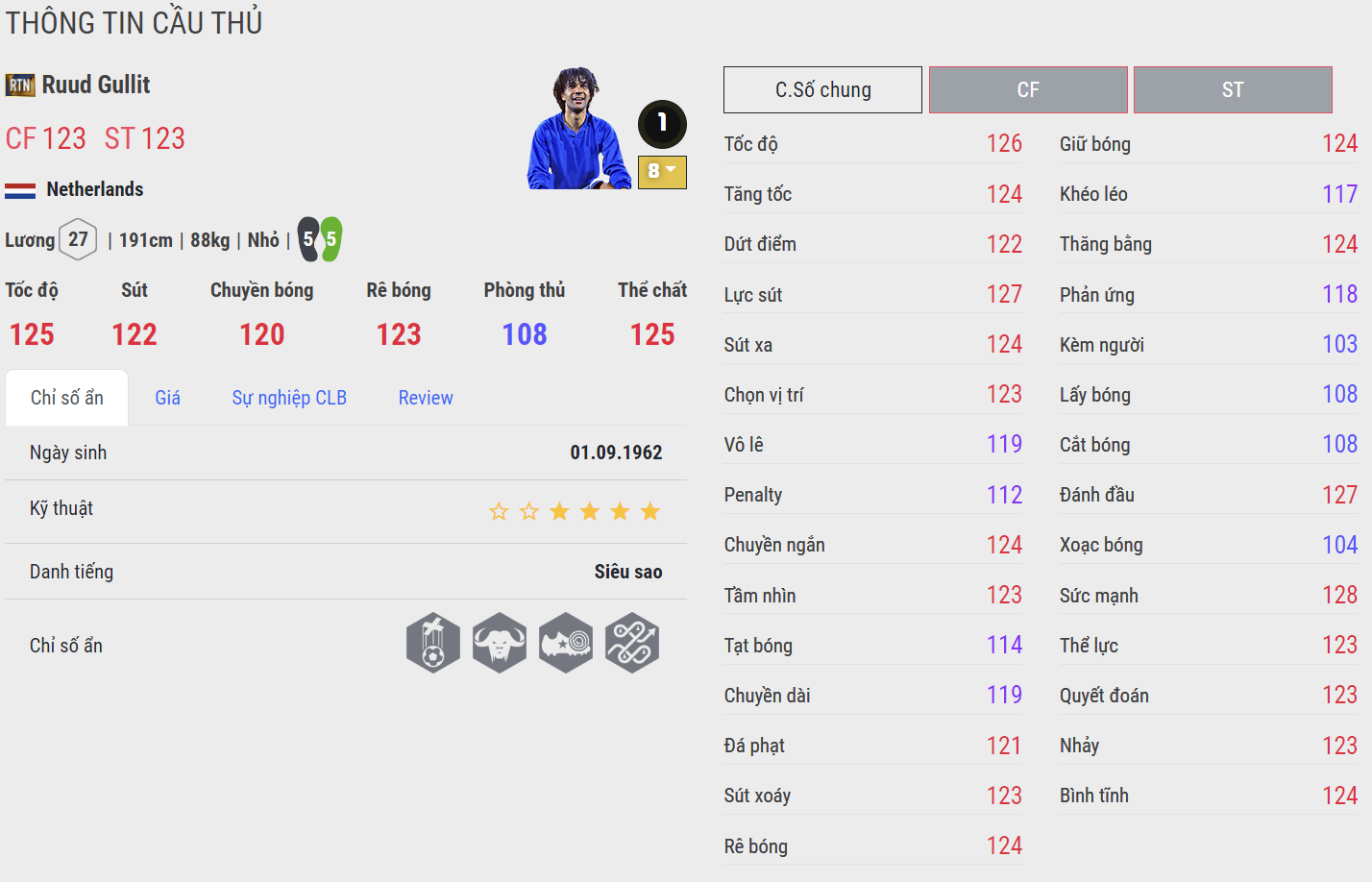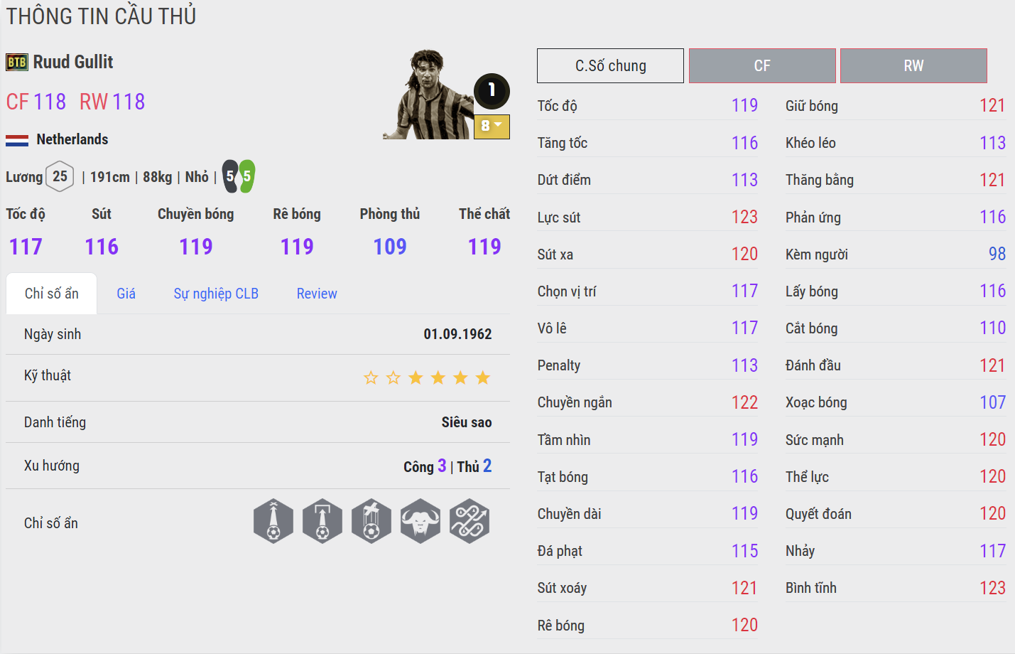 Gullit RTN không phải mùa thẻ có nhiều chỉ số ẩn nhưng lại cho thấy AI rất tốt cùng bộ chỉ số toàn diện giúp anh chơi hiệu quả ở nhiều vị trí. Gullit RTN hơi yếu ở khả năng phòng ngự, anh sẽ thi đấu thiên về vị trí tấn công như CF hoặc CAM.
