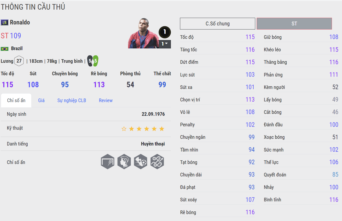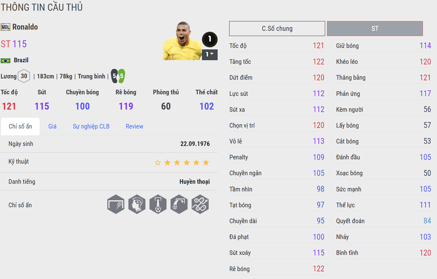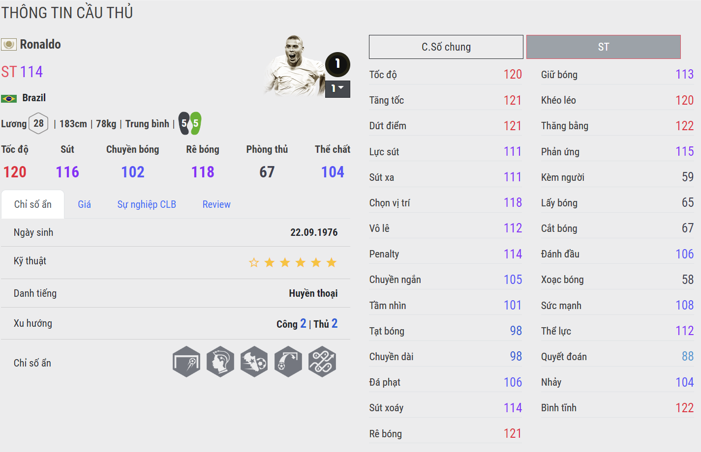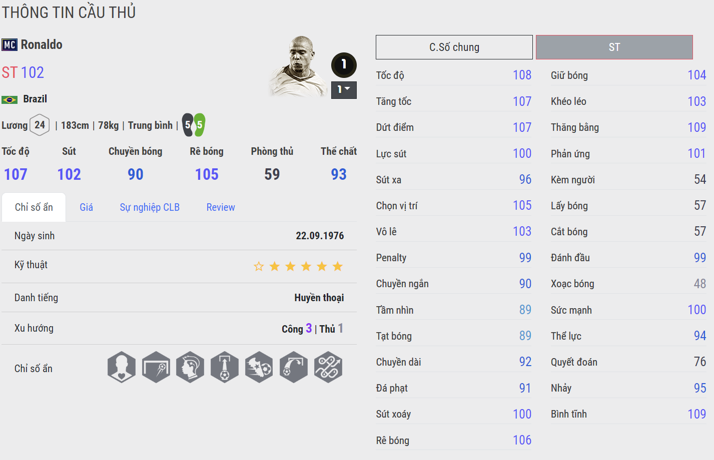Ronaldo ICON vẫn được xem là mùa thẻ xuất sắc nhất của Ronaldo trong FC Online. Không chỉ có AI di chuyển cực khôn và nổi bật, mùa thẻ ICON còn cải thiện cả khả năng sút xa, kỹ năng chuyền bóng cho đến tì đè đều rất khó chịu. Đặc biệt là khả năng chạy chỗ tách người cực bá khiến Rô béo gần như nổi bật hơn hẳn những mùa thẻ kể trên.