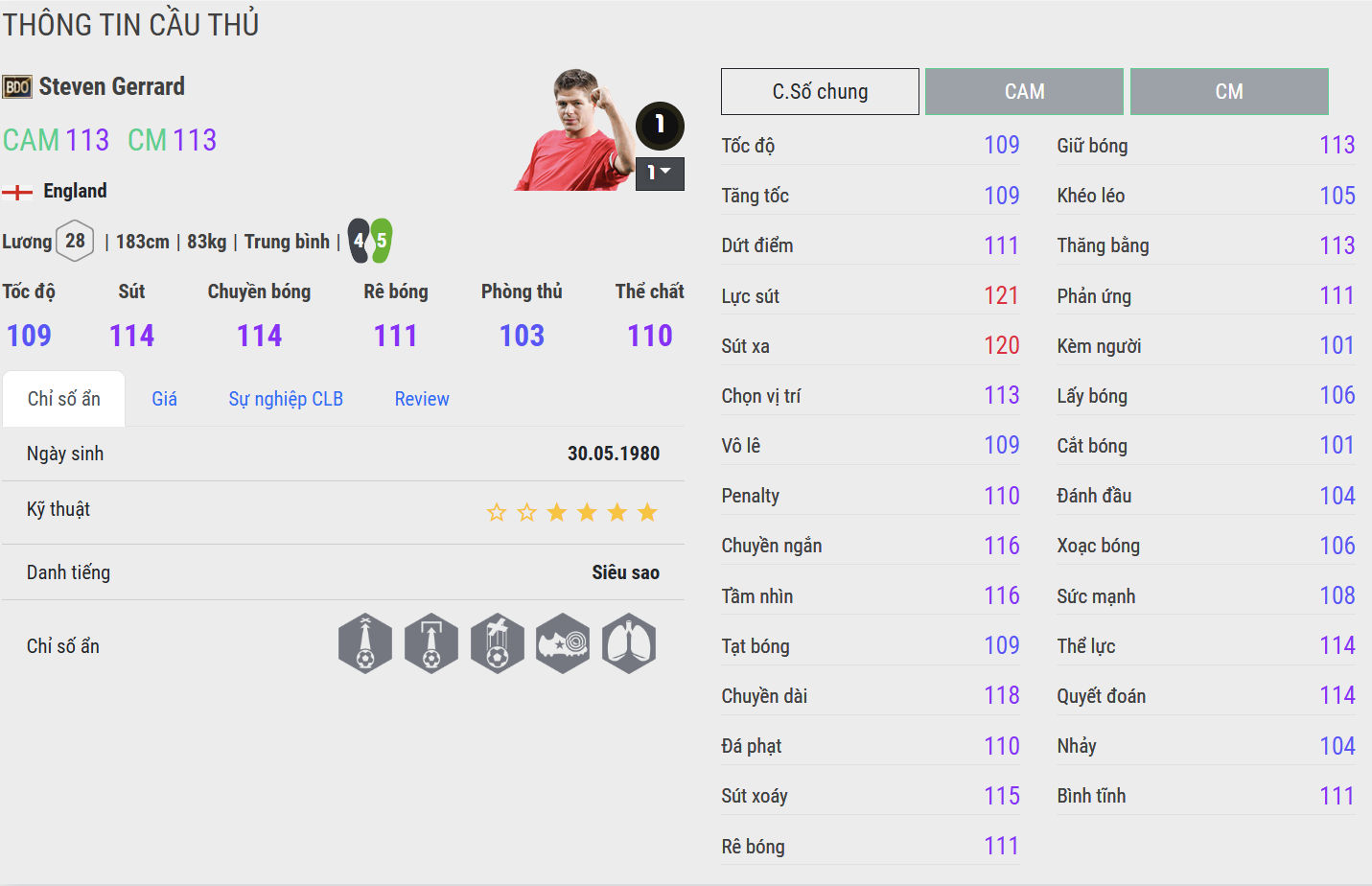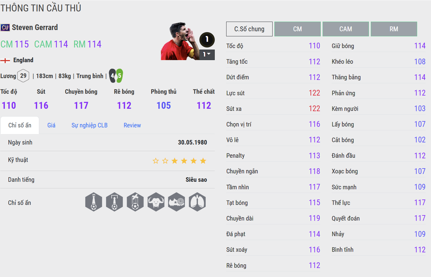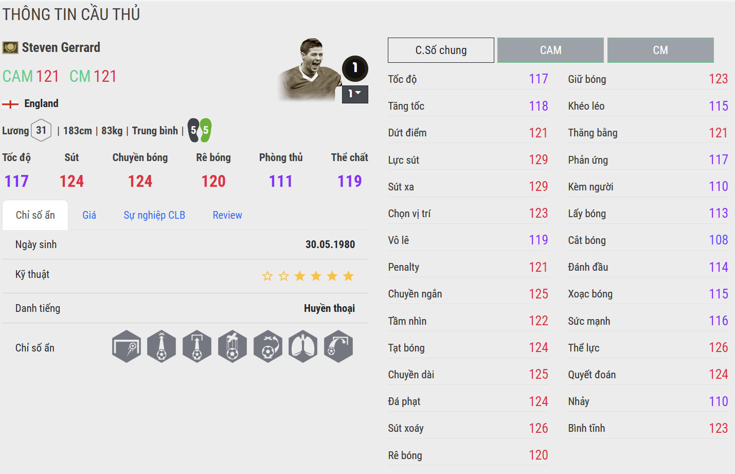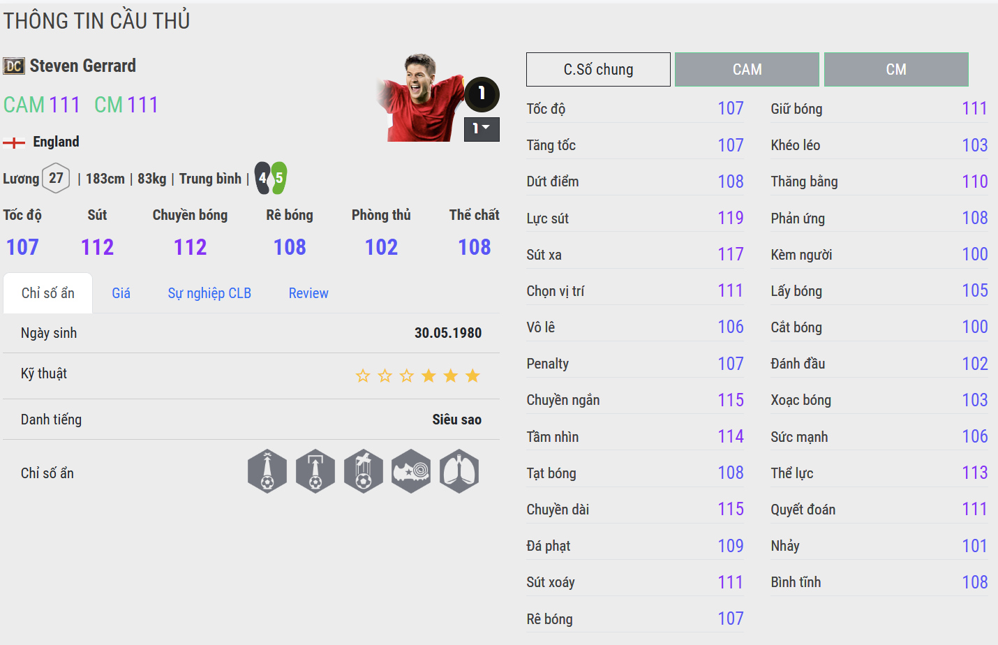 Gerrard nổi bật với chỉ số chuyền dài, dứt điểm và thể lực cao, giúp anh vừa điều phối lối chơi, vừa tham gia tấn công hiệu quả. Những mùa thẻ mạnh như ITM, CU, GRU... mang đến bộ chỉ số ấn tượng, khiến Gerrard trở thành một trong những tiền vệ đáng dùng nhất trong FC Online.
