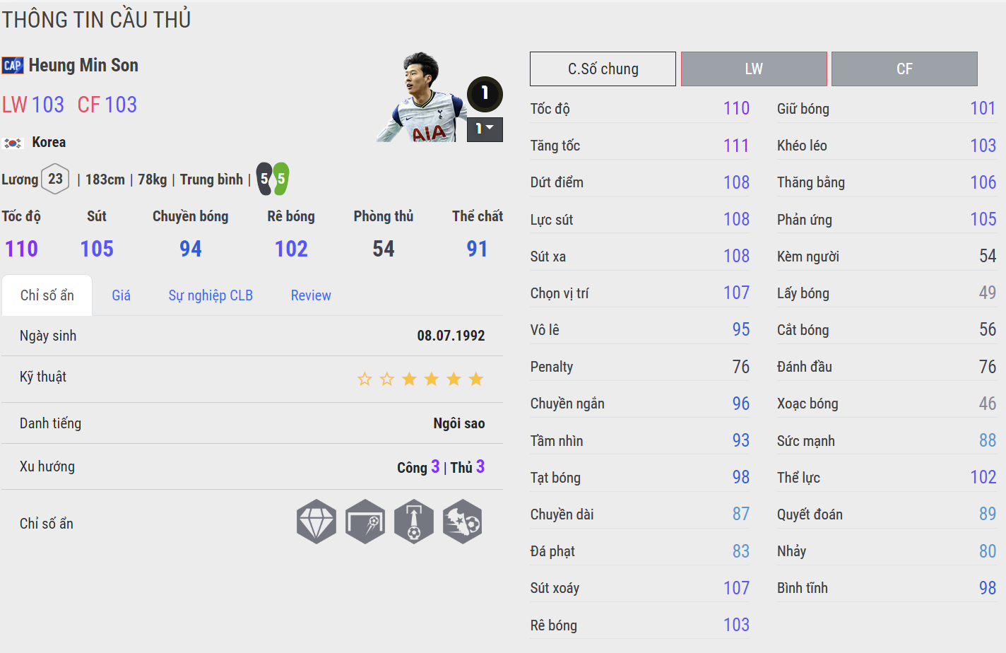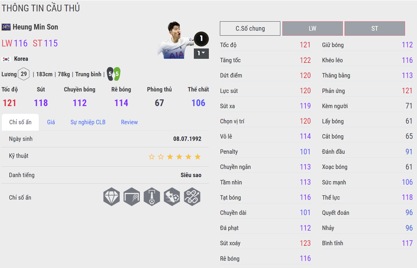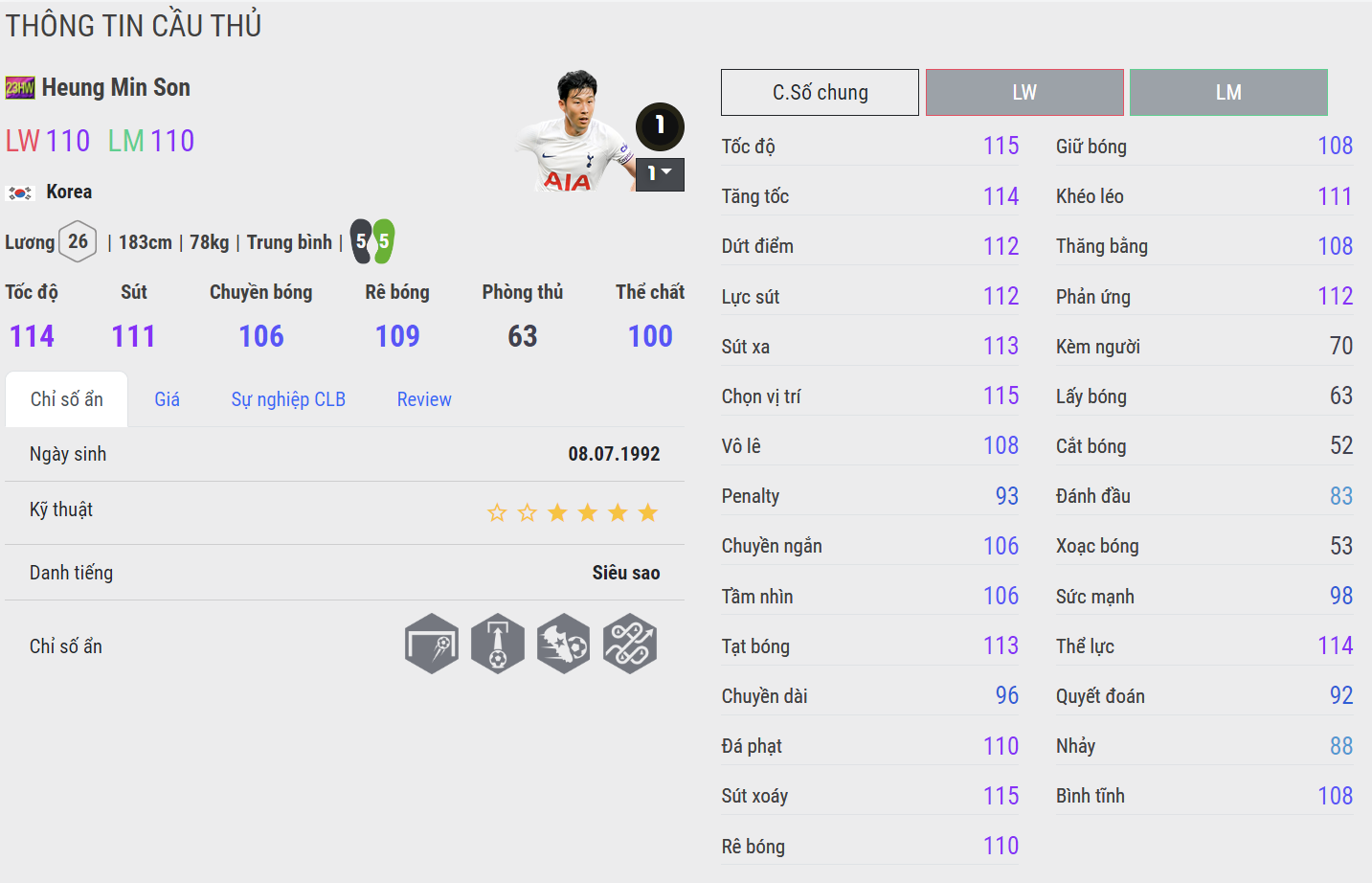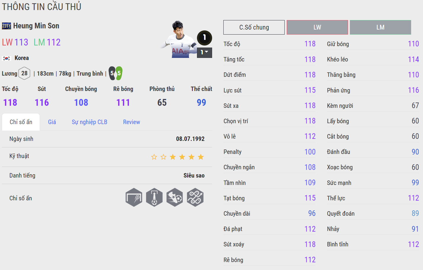 Son Heung Min luôn được coi là một trong những cầu thủ quốc dân hàng đầu trong FC Online. Cầu thủ người Hàn không chỉ có bộ chỉ sốt tấn công toàn diện cho hành lang cánh mà thậm chí còn có thể thi đấu tốt với vai trò hộ công hoặc trung phong cắm.