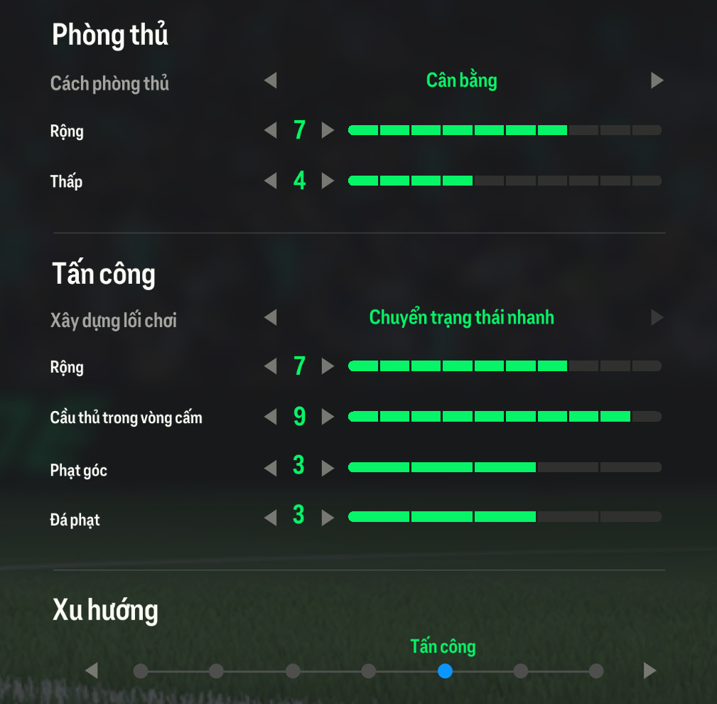 2 vị trí tiền vệ RCM, LCM xu hướng chơi 3-3 và không có thêm thiết lập đặc biệt nào. Trong khi đó vị trí CM trung tâm để xu hướng thủ 3 để ít dâng hơn. 2 vị trí hậu vệ biên công 3 thủ 3 để lên xuống chủ động hơn trong khi đó 2 trung vệ thì vẫn lùi thấp và ít dâng.