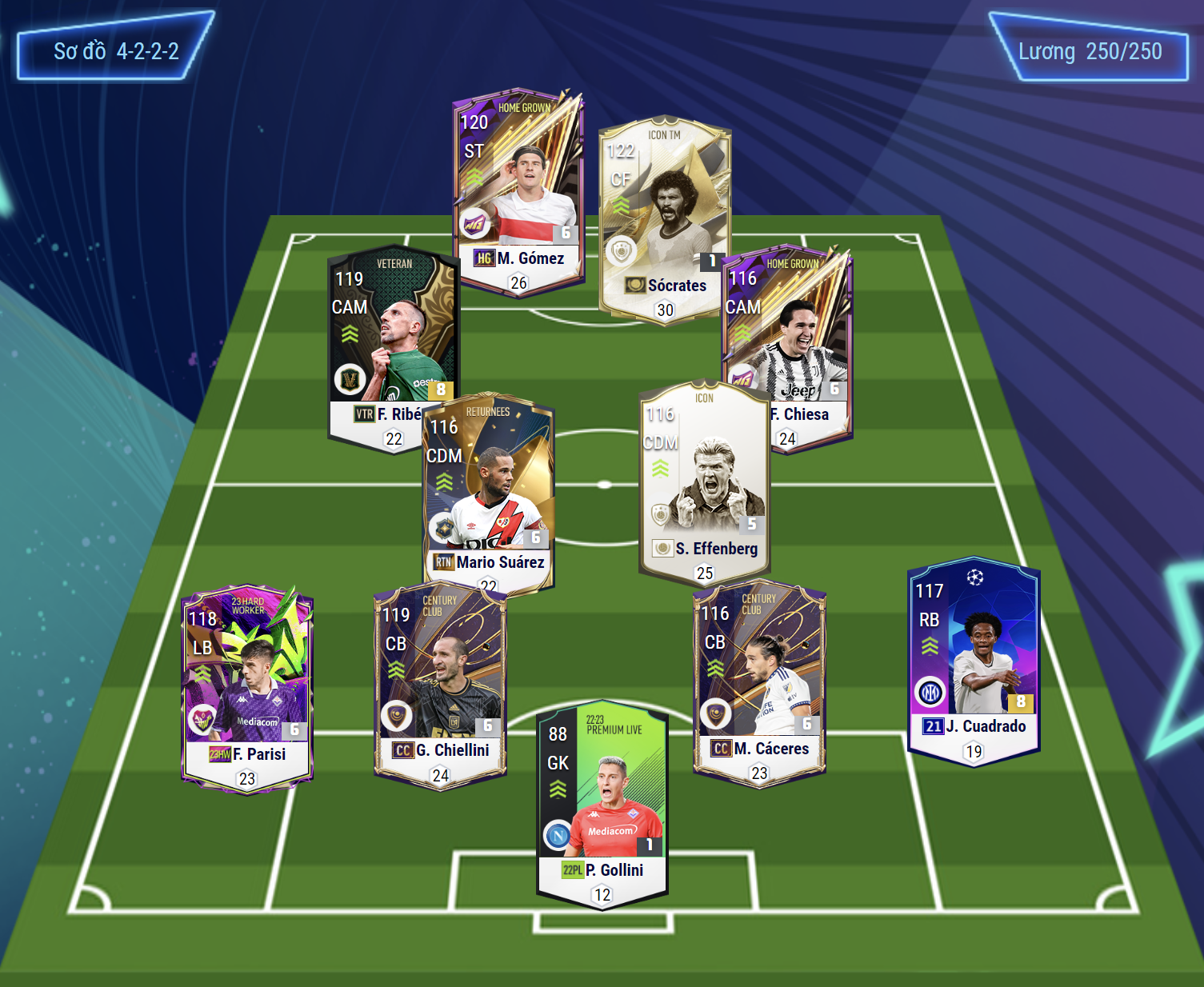 Cặp đôi tiền vệ công lệch cánh sẽ là Ribery và Chiesa. Cả 2 cầu thủ đều được xem là quốc dân ở mỗi bên hành lang cánh khi vừa có tốc độ, sở hữu 2 chân 5-5, có kỹ năng tạt bóng rất tốt và khả năng sút cũng rất ấn tượng.