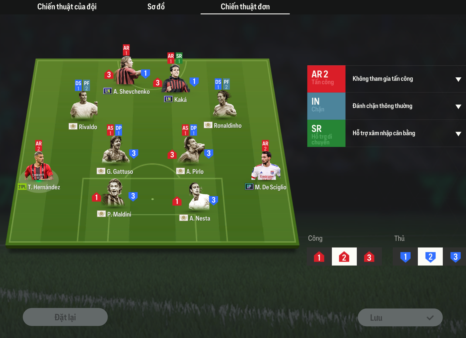 Chiến thuật cá nhân được thiết lập như hình với bộ tứ vệ thi đấu ít dâng, hạn chế tham gia tấn công và chú trọng vào các tình huống phòng ngự. Hàng tiền vệ thi đấu giữ vị trí, xu hướng chơi rộng để hỗ trợ các cầu thu cả về phòng ngự lẫn tấn công.
