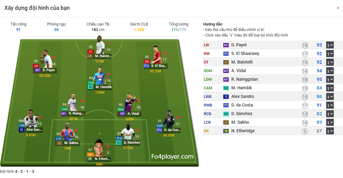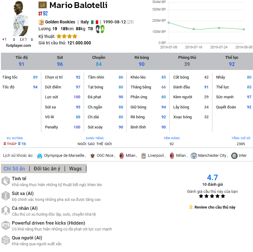 Đội hình với tiền đạo cắm là cái tên vô cùng quen thuộc Balotelli. Cầu thủ khá toàn diện về cả khả năng dứt điểm, tốc độ, xử lý bóng lẫn không chiến.