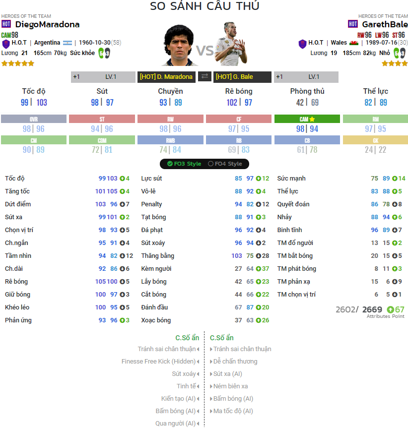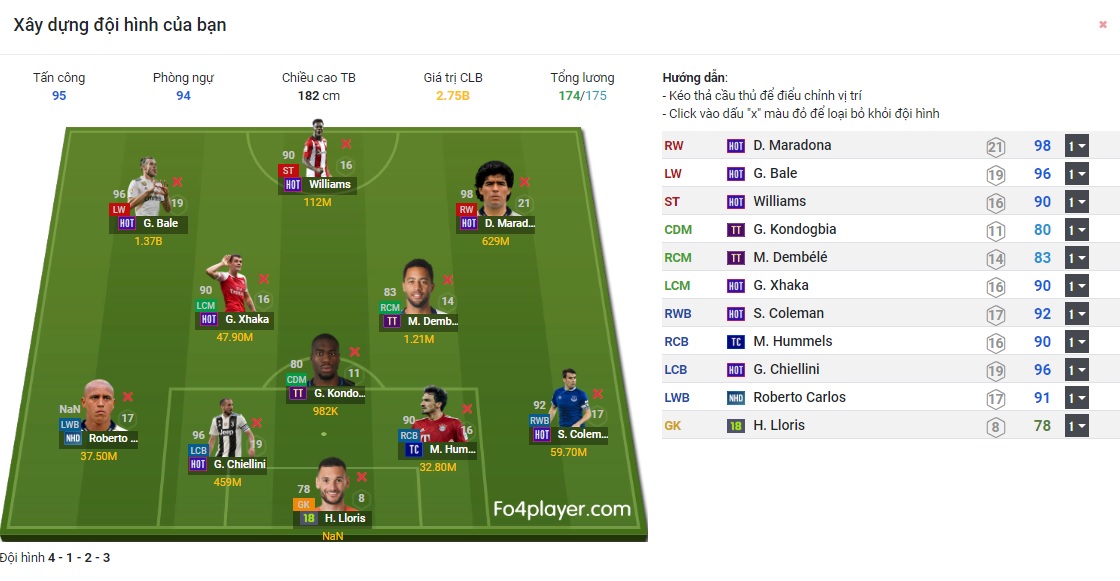 Sơ đồ đội hình với khá nhiều cái tên chất lượng. Bộ 3 đá cao nhất trên hàng công bao gồm Williams, Bale và Maradona. Bộ 3 tấn công này không chỉ có tốc độ tốt mà còn có cả khả năng dứt điểm cũng như khả năng bùng nổ trên sân.