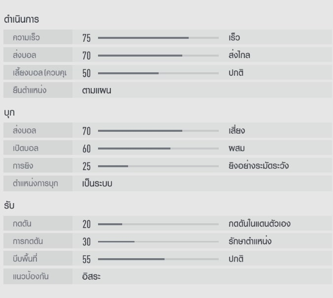 Lối chơi : tổ chức, tấn công : tự do, phòng ngự : tự do