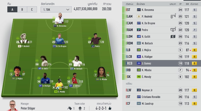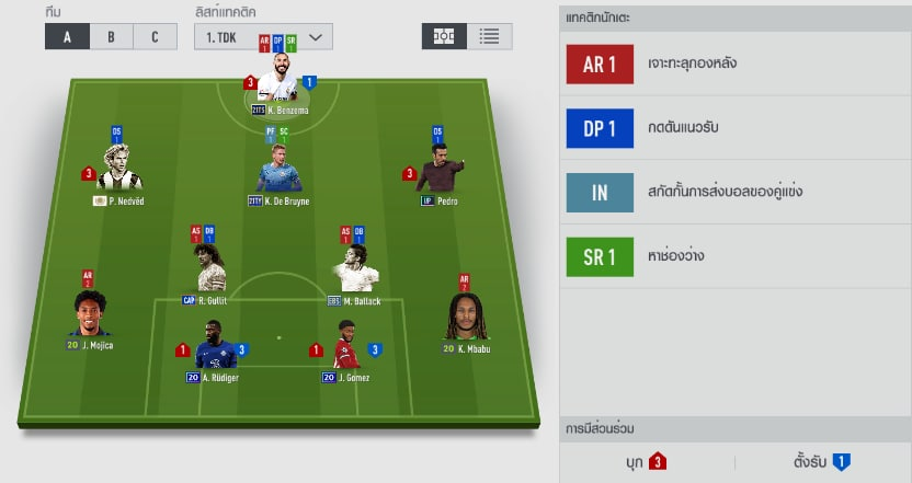 Cặp đôi trung vệ được anh lựa chọn là Rudiger và Jomez, cả hai đều là những CB có chiều cao và tốc độ cực tốt. Trong khi đó cặp đôi tiền vệ phòng ngự là Gullit và Ballack.