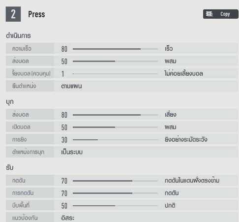 TDKeane sử dụng hai chiến thuật đội là bình thường và áp lực lớn khi thủng lưới. các bạn có thể tham khảo