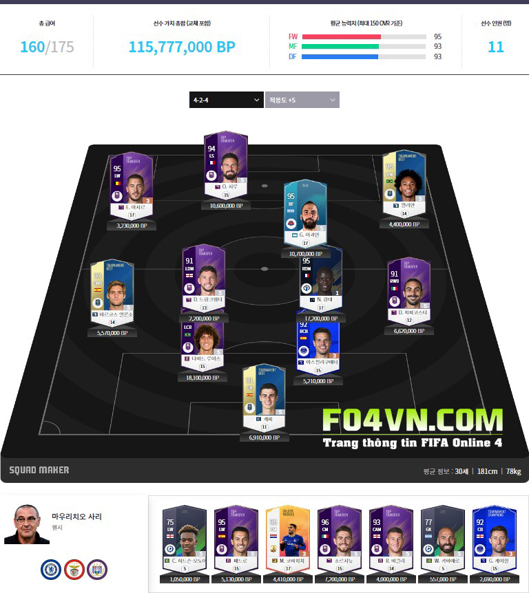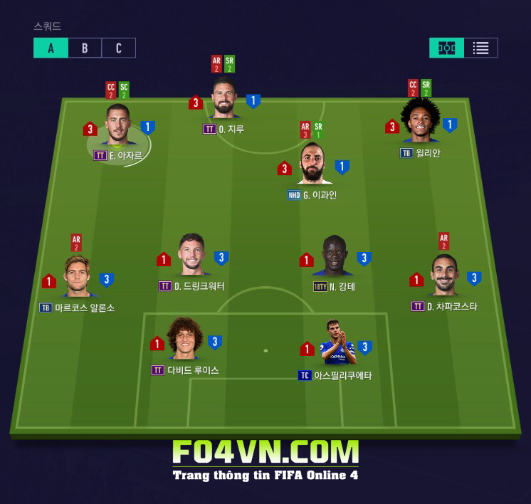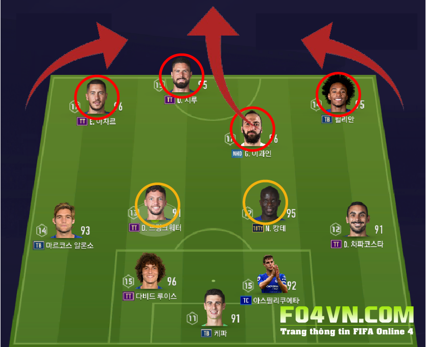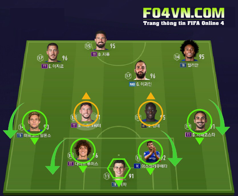 Sơ đồ được lựa chọn là dạng sơ đồ 4-2-4 với bộ tứ tấn công bao gồm Hazard, Willian, Higuain và Giroud