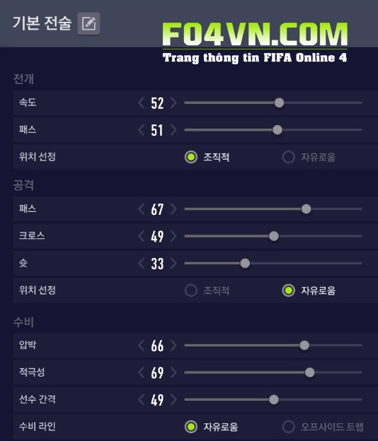 Sơ đồ chiến thuật như hình với lối chơi ở mức trung bình trong khi đó khả năng dâng bóng tấn công sẽ là tốt hơn. Phòng ngự chặt chẽ hơn với việc đẩy gây áp lực và quyết đoán ở mức trên trung bình.