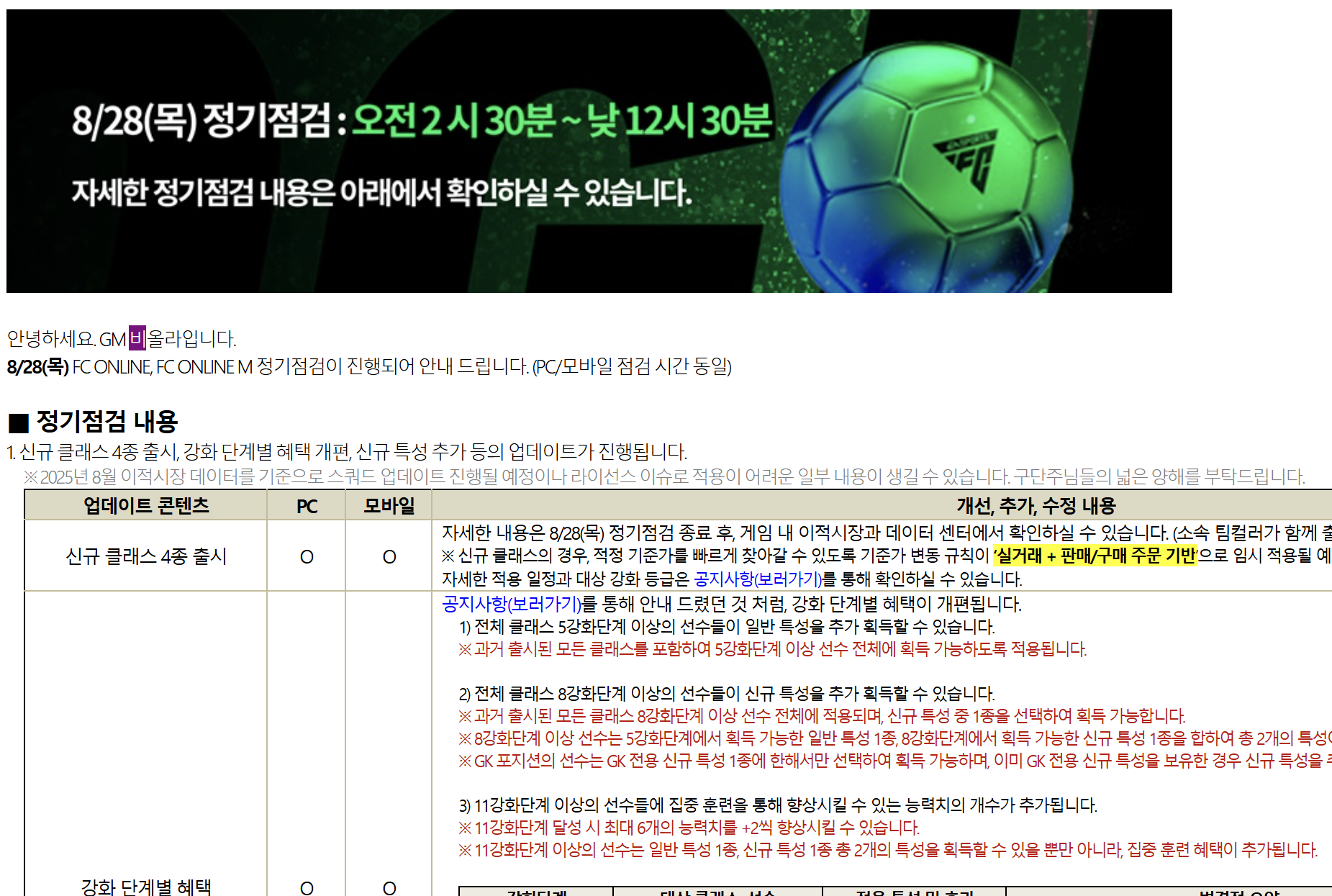 Thông báo từ FC Online Hàn Quốc cho biết, bản cập nhật lớn sẽ chính thức ra mắt vào ngày 28/8/2025. Đây được xem là một trong những lần thay đổi quan trọng, hứa hẹn mang lại nhiều trải nghiệm mới mẻ cho cộng đồng game thủ.