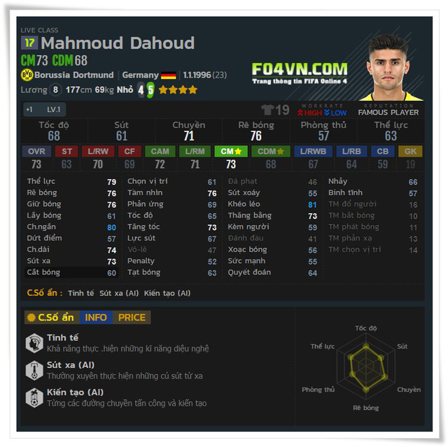 Tuy nhiên, điểm hạn chế của Dahoud là tốc độ và phản ứng tình huống chậm. Chưa kể, kỹ năng dứt điểm má trong (ZD) là điểm yếu của cầu thủ trẻ này, cần hạn chế khi sử dụng.