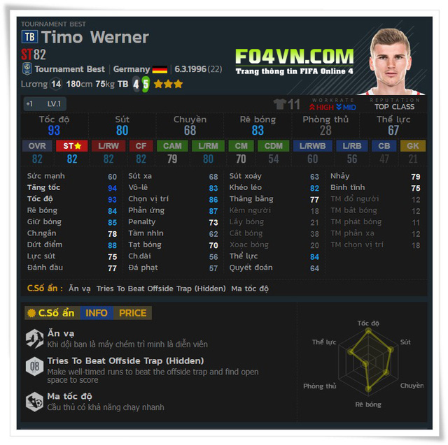 Xét về lối chơi, Werner là một trung phong mẫu cho lối đá hiện đại, ngoài chốt cắm, thì cầu thủ người Đức có thể dạt cánh. Với người chơi sở hữu một đội hình có xu hướng tấn công cánh, chiến thuật thiên về phản công thì Werner TB là 1 cái tên không nên bỏ lỡ.