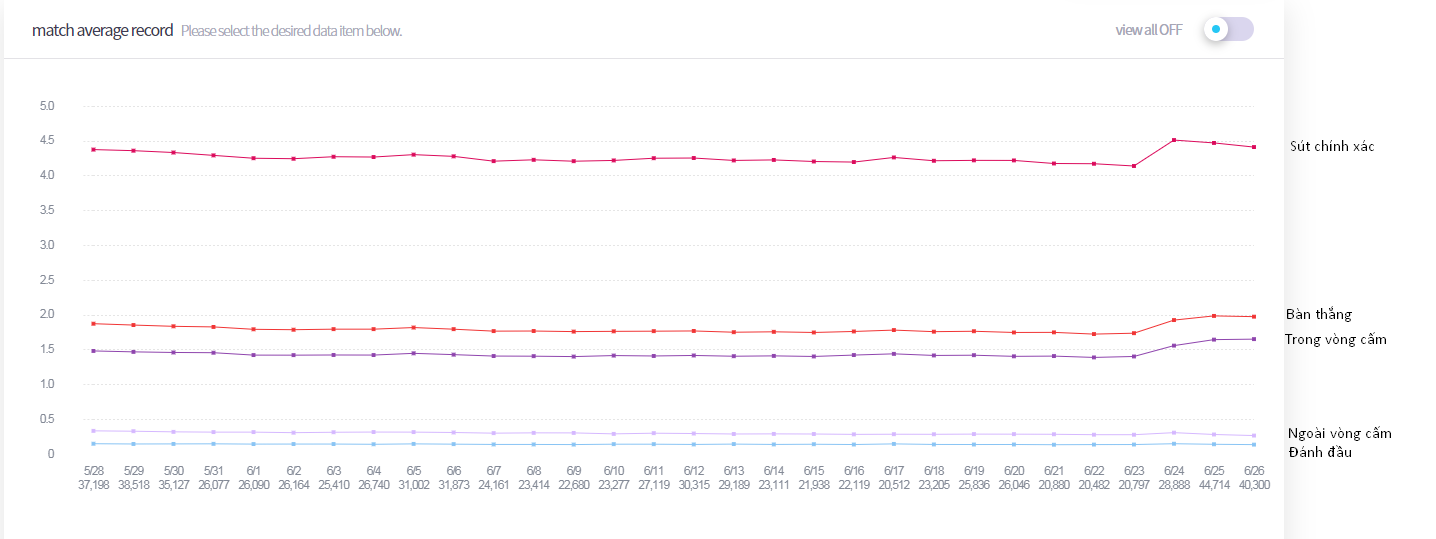 Đầu tiên các bạn có thể thấy tỷ lệ các cú sút chính xác có sự vượt trội hơn hẳn Đặc biệt là vào ngày 24/6 sau khi update. Tuy nhiên lại dang có dấu hiệu giảm dần, lý giải cho điều này fo4vn xin được đưa ra luận điểm như sau : Vào ngày 24/6 khi update xong các game thủ chưa tìm được sơ đồ, cũng như chưa thích nghi được lối đá căng ngang từ cánh vào, việc ngăn chặn các tiền đạo đệm bóng cận thành gần như rất khó. Nhưng sau 3 ngày mọi thứ có vẻ bắt đầu được kiểm soát. Và số lượng cú sút trung bình trong một trận đã có dấu hiệu giảm.