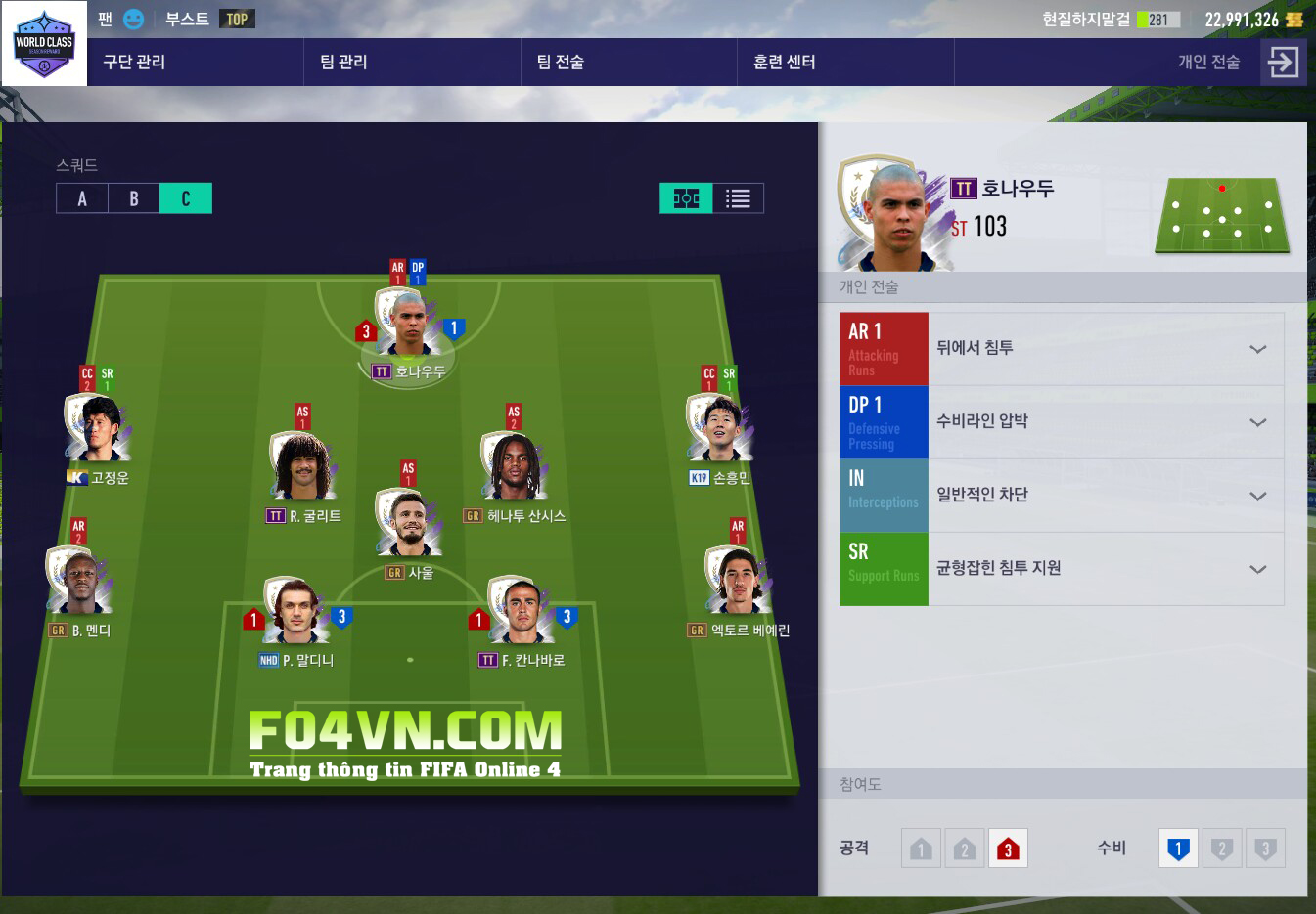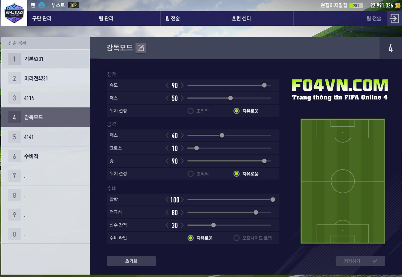 Để gây áp lực một cách dồn dập, tốc độ chơi cần ở mức rất cao lên tới 90. Cùng mức chuyền 50 giúp cho cự li đội hình giãn ở mức vừa phải.