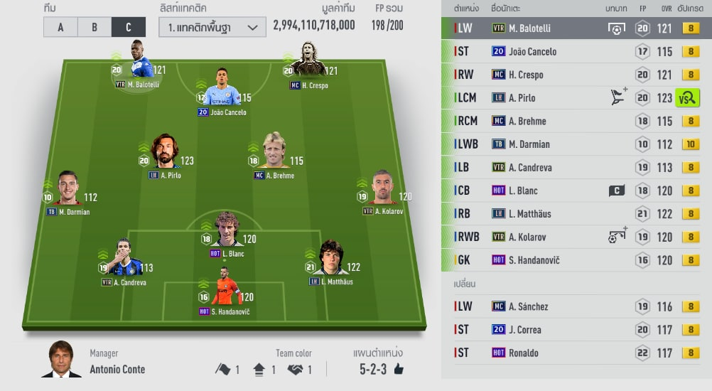 HLV của sơ đồ này Antonio Conte - chuẩn cho các fan Inter Milan. Một điểm lạ của sơ đồ này là cái tên Joan cancelo đá ST. Tuy nhiên nếu xét theo các tiêu chí là đây là một cầu thủ khá toàn diện.