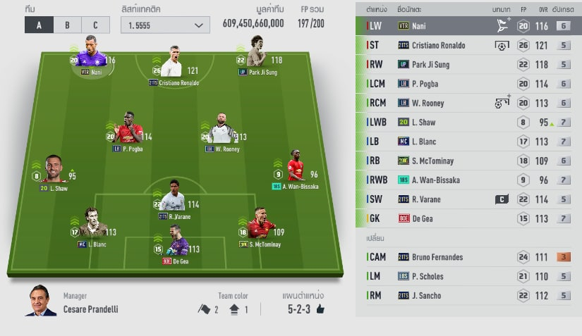 Với việc MU đón bản hợp đồng là Varane, team color của đội bóng này trong chế độ GLXH sẽ càng mạnh hơn khi có được hàng quốc dân Varane trong team. Dưới đây là một sơ đồ 5-2-3 nữa của team Mu mà các bạn có thể tham khảo