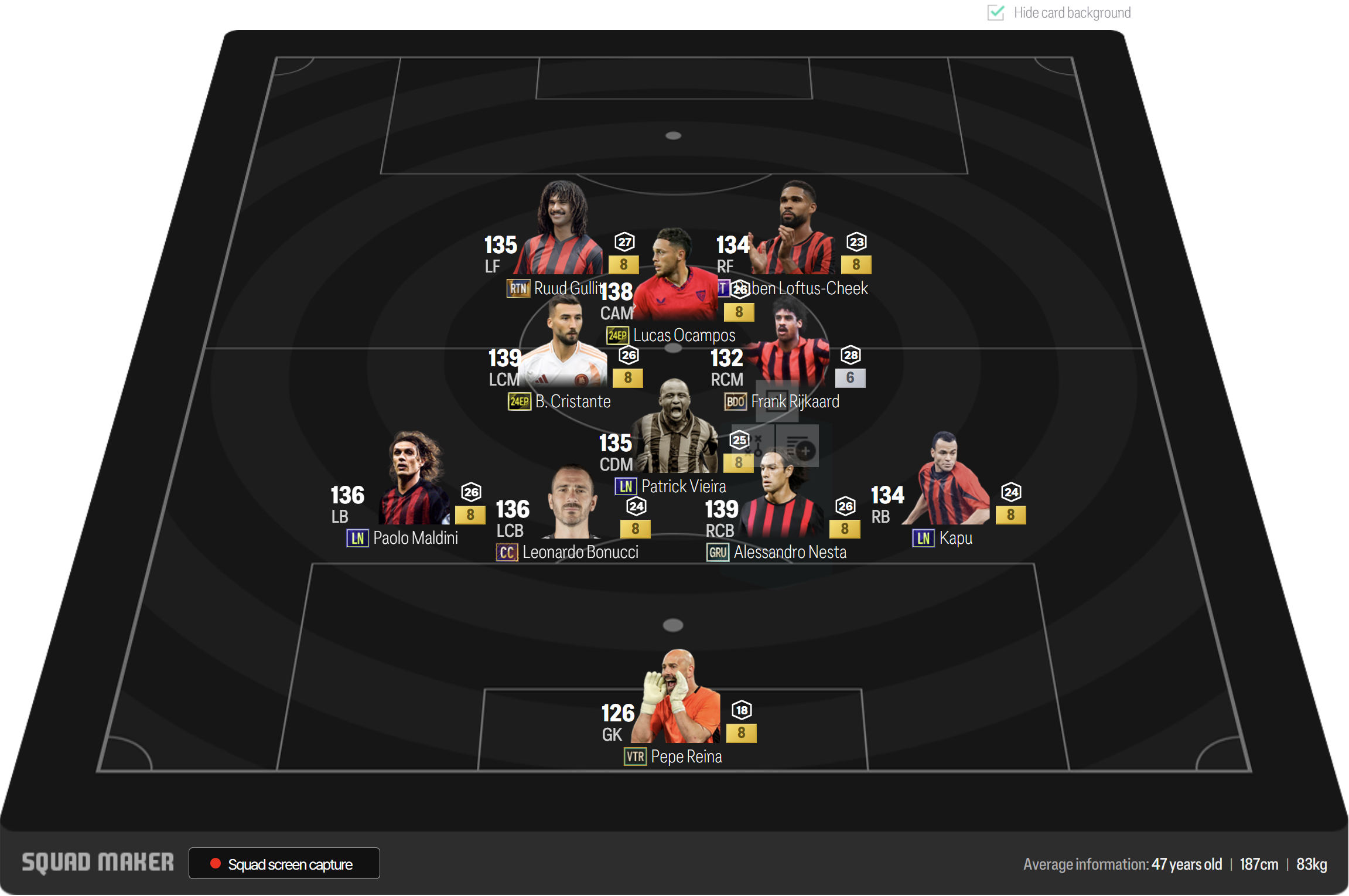 Sơ đồ 41212 với 2 vị trí chơi cao nhất tên hàng công là 2 vị trí LF, RF. Hai vị trí hộ công này lần lượt là sự góp mặt của 2 cái tên Gullit và Loftus-Cheek. Tiền vệ công CAM được tin dùng là Ocampos, trong khi cặp tiền vệ trung tâm LCM, RCM lần lượt là Cristante và Rijkaard.
