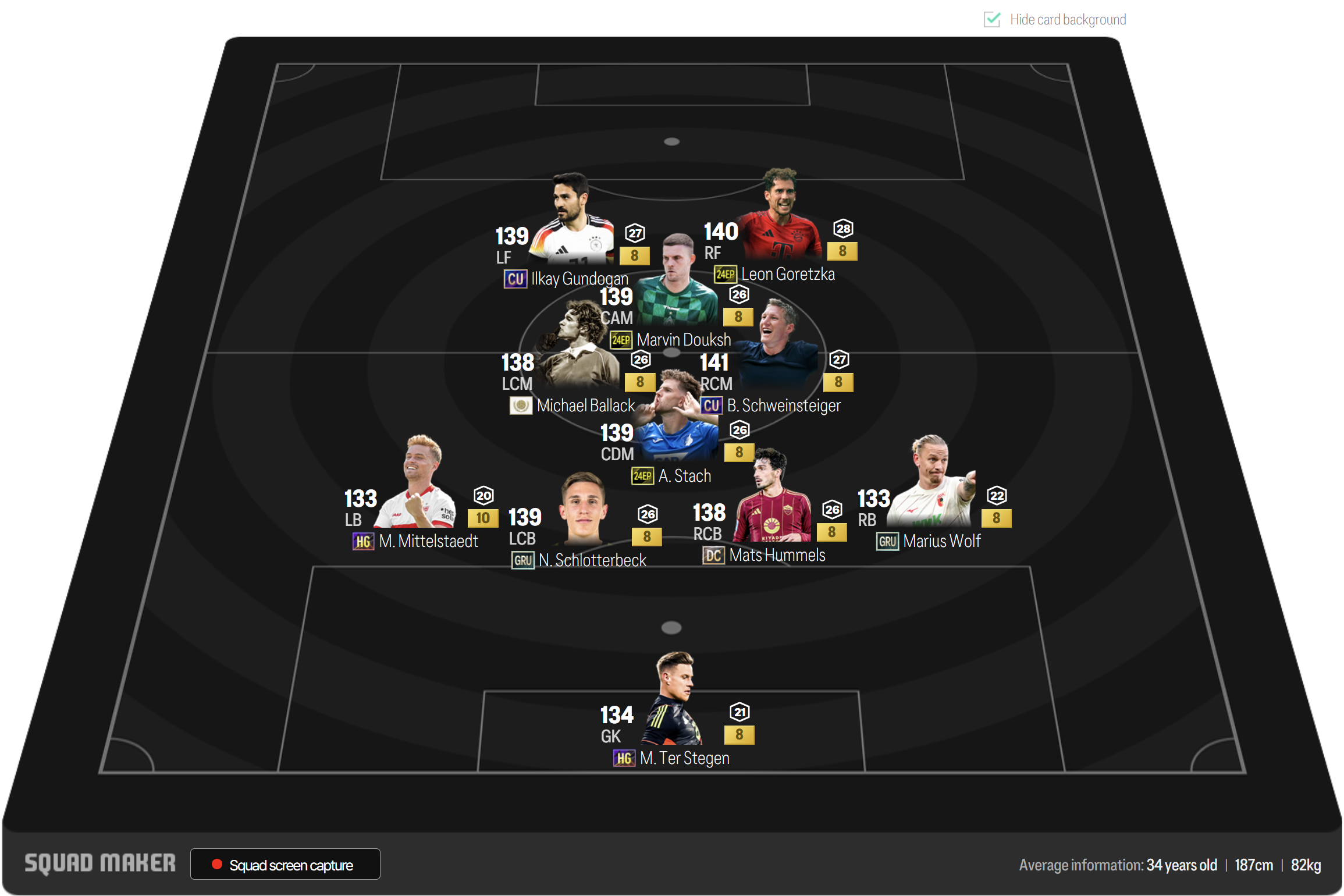 Sơ đồ 41212 được lựa chọn với cặp đôi hộ công LF, RF lần lượt là Gundogan và Goretzka, cả 2 đều là mẫu tiền vệ khá toàn diện và có khả năng đá GLXH cực kì hay. Tiền vệ công Ducksch là một cái tên mới mẻ nhưng rất đáng dùng. Cặp tiền vệ trung tâm Ballack và Schweinsteiger được lựa chọn đảm bảo khả năng kiểm soát tốt tuyến giữa cả về tranh chấp phòng ngự lẫn tham gia tấn công.