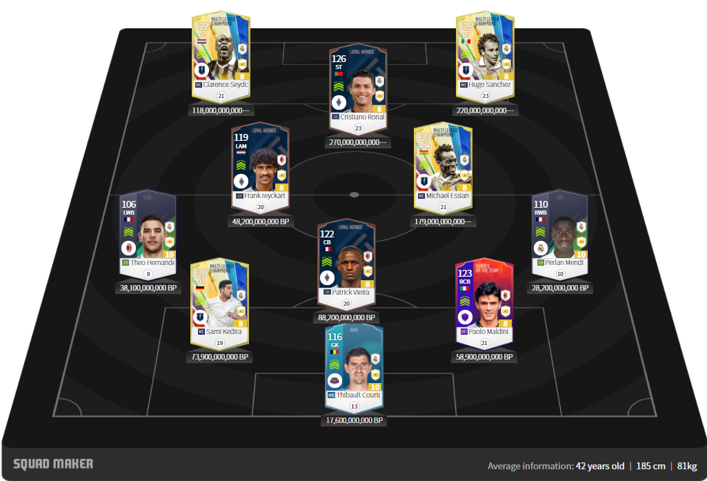 Với mức lương 200 thì đây là một đội hình quá lý tưởng hiện tại. Tất nhiên bạn có thể thay một vài vị trí mà vẫn giữ được buff team như Rijkaard bằng Gullit. Hugo Sanchez bằng Ronaldo De Lima. Trong hình thì chủ sở hữu của team sử dụng những cầu thủ cộng rất cao nên chúng ta không thấy sự xuất hiện của các cầu thủ quốc dân nêu trên.