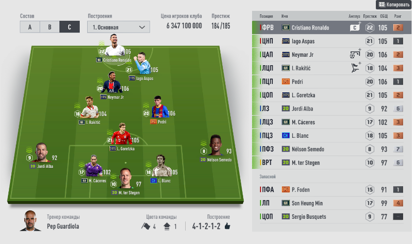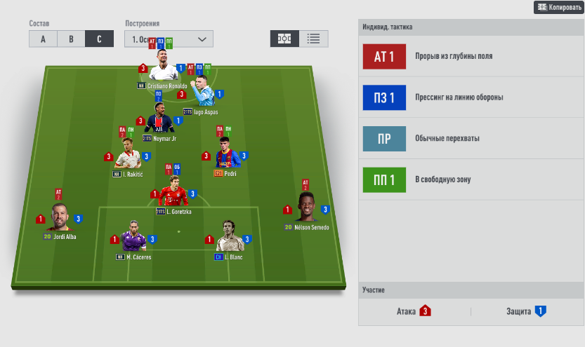 Về cơ bản vẫn là những thiết lập với 3 cái tên tiền đạo chơi cao nhất và luôn túc trực bên phần sân đối phương. Neymar sẽ đóng vai trò như một hộ công cho hai tiền đạo là Ronaldo và Aspas. Điểm yếu của đội hình chính là không có hai cánh, và hai hậu vệ được giữ luôn ở phần sân nhà.