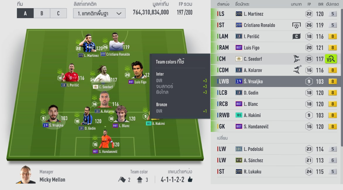Ngoài Ronaldo có lẽ do chủ nhân của đội hình muốn tăng cường thêm sức tấn công nên cho " nhập khẩu" về, còn lại 10 cái tên nằm trong team color của CLB đều rất chất lượng. Thậm chí những vị trí của Seedorf hay Perisic là tối ưu.