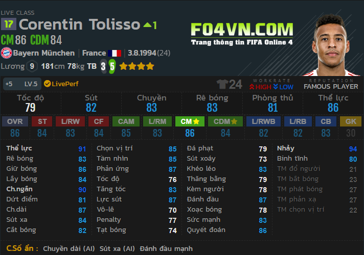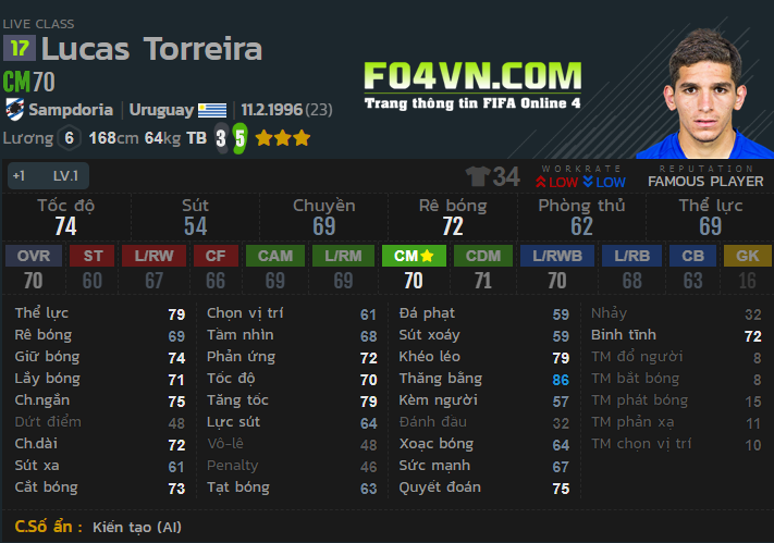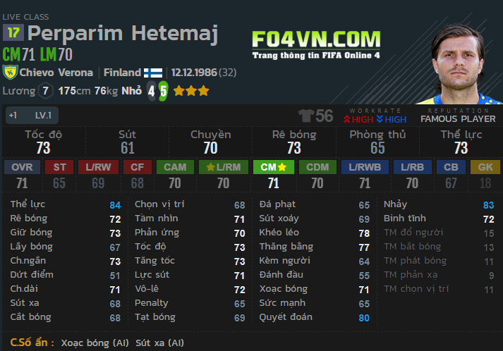 *Ưu điểm: Trong FO4 với vị trí sở trường là CM nhưng anh có thể đá được cả hộ công lẫn , tiền đạo cánh và cả tiền vệ phòng ngự . nay lại được live boots +1 . Anh chuyền dài tốt , sút xa tốt và có chỉ số ẩn đánh đầu mạnh để những pha không chiến trở nên ảo diệu hơn.