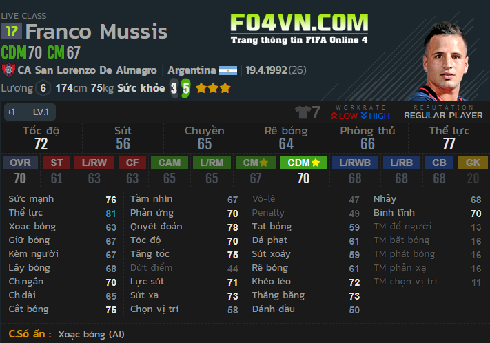 *Ưu điểm : thể lực tốt , ít dâng cao , tốc độ ổn giúp các pha lấy bóng không quá thua thiệt về mặt tốc độ , cắt bóng cũng là một điểm mạnh của f.mussis , chỉ số ẩn xoạc bóng với gameplay hiện tại các trung vệ có phần ngáo ngáo thì hãy dùng các tiền vệ phòng ngự có chỉ số ẩn xoạc bóng để phòng ngự từ xa