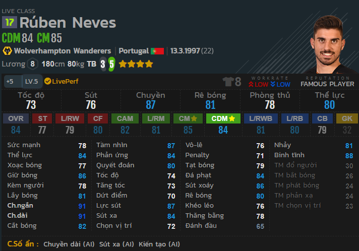 Ruben Neves là cầu thủ người Bồ Đào Nha sinh năm 1997. Anh hiện đang thuộc biên chế Clb Wolverhampton ƯU ĐIỂM: - Cao 1m80 nặng 80kg và thể hình TB khiến cầu thủ này rất đầm người và khó bị đốn ngã. - Kỹ năng rê bóng ở mức khá, qua người, ngoặt bóng đều rất ổn định. - Kỹ năng chuyền bóng cực kỳ tốt. Từ chuyền dài đến chuyền ngắn, những đường chuyền đều rất chính xác và có một tốc độ nhanh, khó bị bắt bài - Khả năng phòng ngự tương đối ổn với việc rình cắt bóng, chọc bóng, tì đè đều vô cùng khó chịu. Nhược điểm: - Tốc độ chạy chậm, bứt tốc chậm, dễ dàng bị đuổi và cướp bóng nếu gặp những trung vệ hoặc tiền vệ phòng ngự có tốc độ ổn. - Khả năng sút xa kém, bóng đi không hiểm, lực không quá mạnh. - Xu hướng công thủ 1-1 tuy nhiên lại có tầm hoạt động cực kì rộng lên tới 87 đã khiến vị trí này chạy nhiều, hay bỏ vị trí tăng áp lực cho hàng công hơn nhé.