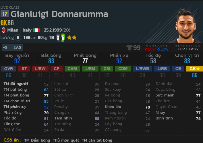 Donnarumma là cầu thủ người Italy thuộc biên chế clb AC Milan. Chiều cao 1m96 nặng 90 kg và thể hình TB là vô cùng lý tưởng cho một thủ môn. Mức lương 8 cũng là một mức lương hợp lý cho 1 cầu thủ giá rẻ.
