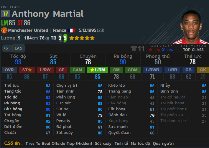 Martial là cầu thủ chuyên nghiệp người Pháp đang thuộc biên chế CLB Manchester United. Với chiều cao 1m84 và nặng 76kg ,Martial có thể hình TB.Vị trí sở trường là ST hoặc RM. Lương 9. Xu hướng công thủ 1-1
