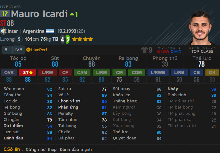 Mauro Icardi là tiền đạo người Argentina đang giữ băng thủ quân của nửa xanh thành Milan.Chiều cao 1m81,cân nặng 75kg và thể hình TB. Vị trí sở trường ST. Lương 9. Xu hướng công thủ 1-2
