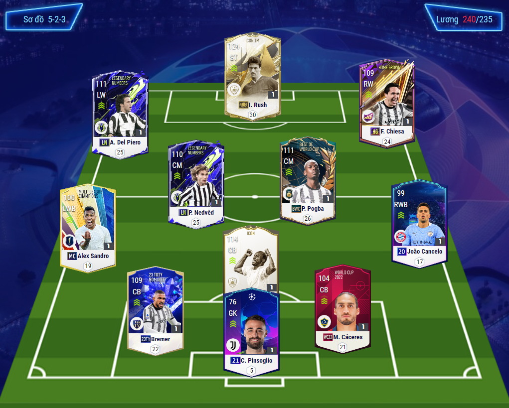Tuy nhiên điểm yếu của team Juventus cố hữu từ trước đến giờ vẫn là ở hàng thủ, khi mà các cầu thủ rất hay ở ngoài đời như Chiellini, Bonucci chưa bao giờ có được một mùa giải đủ sức cạnh tranh trong game. Vậy phương án nào là phù hợp cho một team như Juventus. Dưới đây là một ví dụ với 5-2-3 và HLV sử dụng bàn phím trong thi đấu xếp hạng.