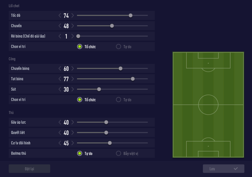 Đây là chiến thuật đơn của đội hình, các bạn có thể thấy là hai cầu thủ hậu vệ cánh được thiết lập luôn luôn chồng cánh và xu hướng 3/3 với việc dâng cao liên tục và hai tiền vệ trung tâm sẽ làm cầu nối chung chuyển để nhồi bóng liên tục ra biên. Hai cầu thủ LW RW cũng được thiết lập bám biên, như vậy sẽ luôn có 2 cầu thủ của bạn chăm sóc hậu vệ cánh của đối phương, và gần như đối phương sẽ rất khó để xử lý kịp với gameplay 9.0 đã có chút lỗi hiện tại.
