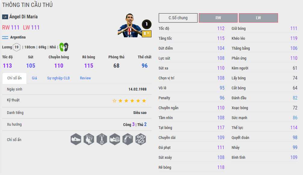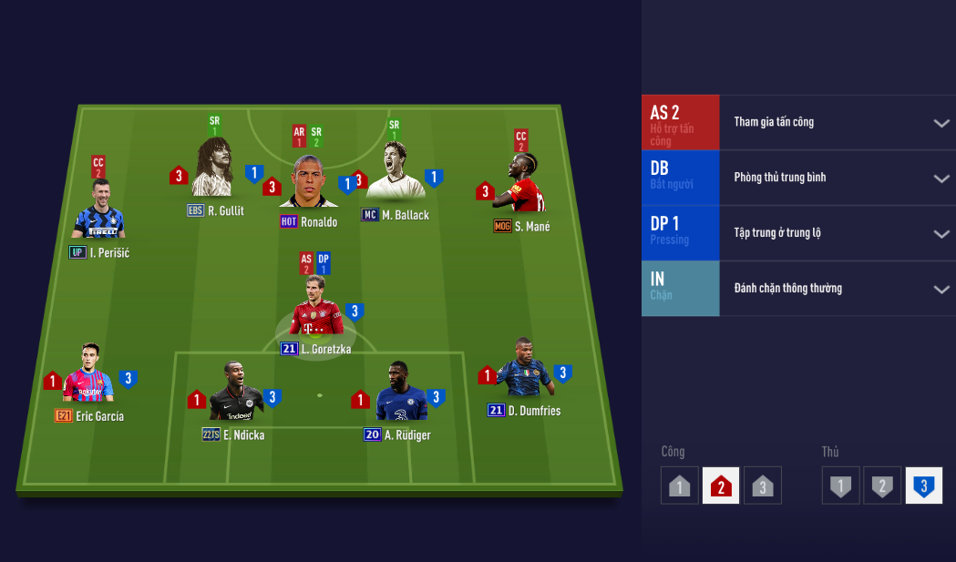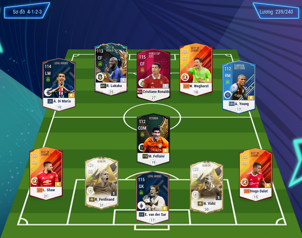 Trong sơ đồ này, vai trò của hai tiền vệ cánh là vô cùng quan trọng, bạn phải chọn những cầu thủ có chỉ số tạt bóng cao để tăng độ chính xác trong các pha tạt bóng. tối thiểu phải là 110 ở level 1 của cầu thủ đó. Trong đội hình trên thì Di Maria và Young đều là hai cầu thủ có chỉ số tạt bóng đạt yêu cầu và quỹ đạo tạt bóng khá cong.