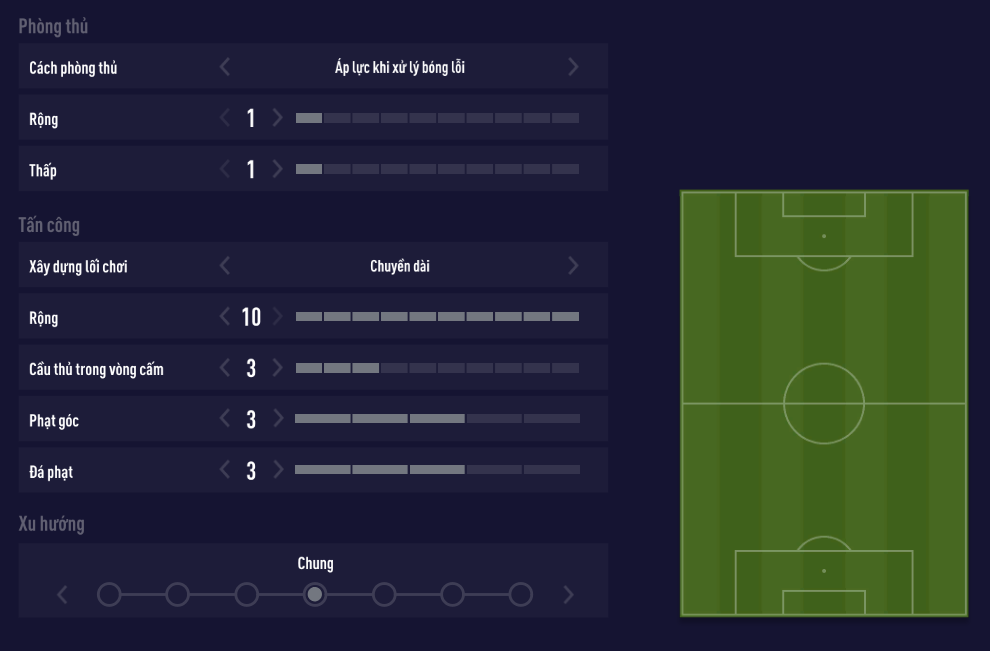 Đây là một ví dụ với đội hình Manchester United, với 4 cầu thủ có chiều cao vượt trội là Lukaku, Weghorst, Fellaini và Ronaldo. Trong đó chiều cao của Ronaldo chỉ là 1m87 nhưng bù lại cảm quan vị trí cũng như khả năng chơi đầu của Ronaldo có thể đánh giá là tốt hơn 3 cầu thủ còn lại rất nhiều.