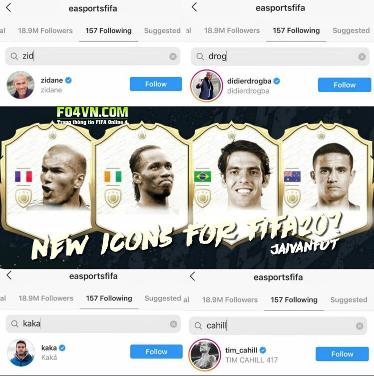 Mới đây, rò rỉ thông tin đăng tải thêm thông tin về việc ra mắt một số huyền thoại mới trong FIFA. Danh sách của 4 cái tên tiếp theo có mặt trong thẻ ICON bao gồm : Zidane. Drogba, Kaka và Tim Cahill.