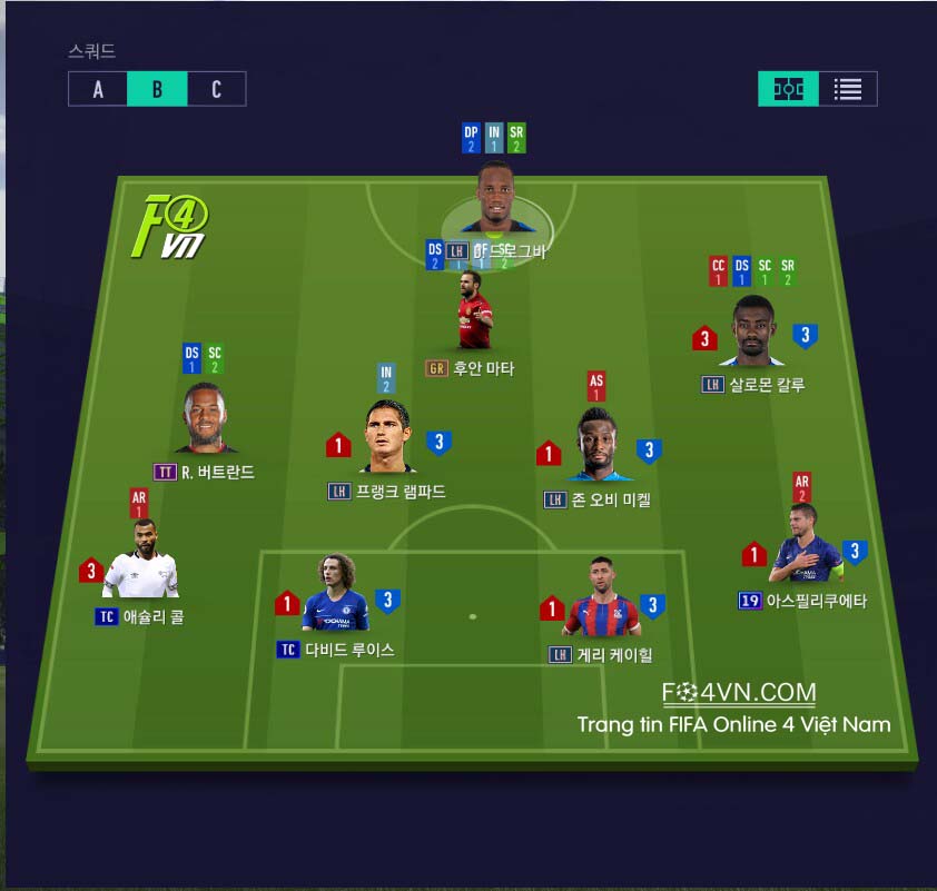Mata và Drogba thiết lập chơi tuyến phòng ngự, tham gia tranh cướp bóng ngay bên phần sân đối phương. Trong khi đó thì Cole được thiết lập luôn luôn chồng cánh, để đảm bảo tính cân bằng trong lối chơi.