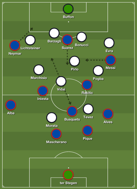 Lối chơi chính của Barcelona vẫn là Tiki-taka và tận dụng những tình huống phối hợp tấn công nhỏ để xuyên phá hàng phòng ngự của đối phương. Cùng với đó, xu hướng di chuyển của những nhân tố trên sân cũng rất quan trọng. Sơ đồ chiến thuật cá nhân và tổng quát Sơ đồ lối chơi có chút chỉnh sửa theo từng chức năng đặc trưng của các cầu thủ trên sân. Đặc biệt,vị trí CDM được kéo về CB hoặc có thể là SW nhằm biến cầu thủ này thành một tiền vệ phòng ngự lùi sâu và chỉ ở nhà. Điều này hạn chế việc dâng lên quá đà dẫn đến hổng vị trí.