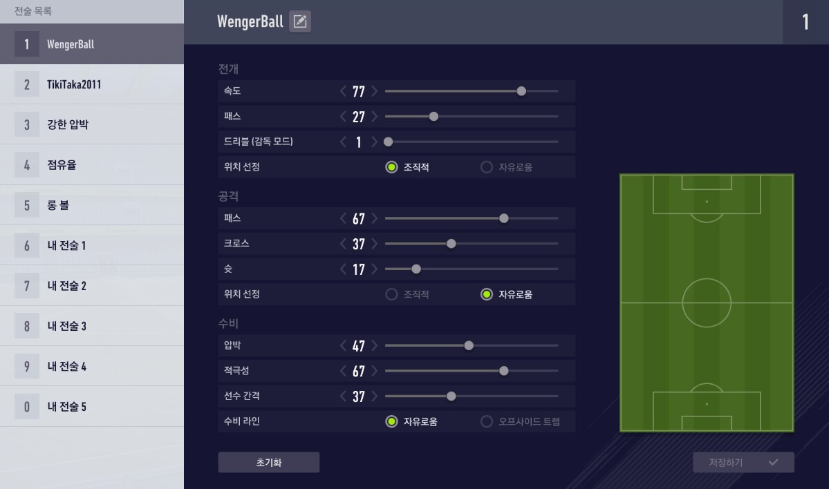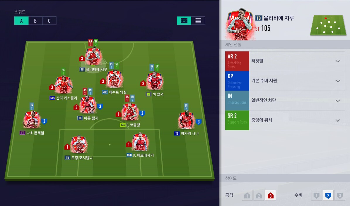 Chiến thuật cá nhân của đội hình được thiết lập như hình bên dưới với việc để các cầu thủ đi đấu tấn công một cách tích cực. Ngoài ra mỗi cá nhân có một thiết lập đa dạng khác nhau để tối ưu hóa lối chơi của toàn đội.