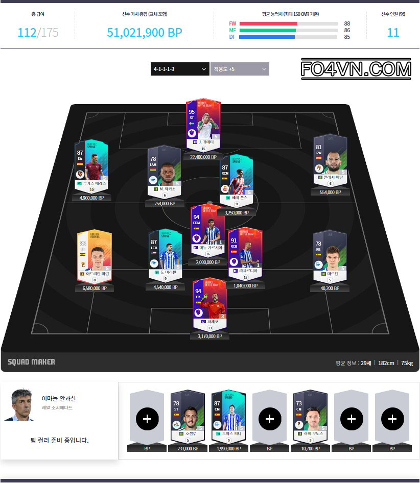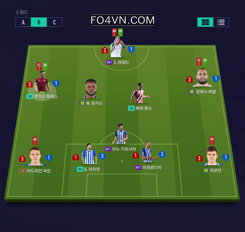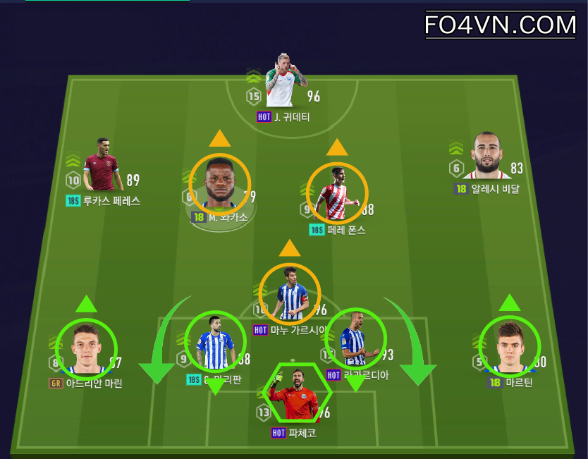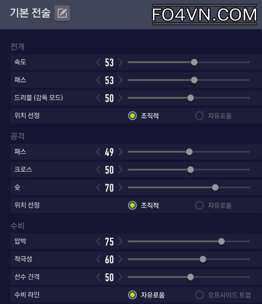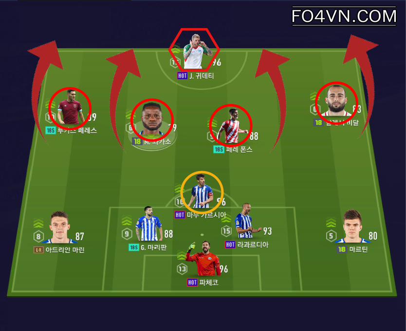 Đội hình này cũng có vừa đủ những vị trí cần và có chỉ số khá ổn. Với chiến thuật cá nhân được thiết lập như hình dưới. Chỉ thiết lập vị trí cho những cầu thủ tấn công và phòng ngự. Tuyến giữa sẽ để các cầu thủ di chuyển tự do và không có thiết lập cụ thể nào.