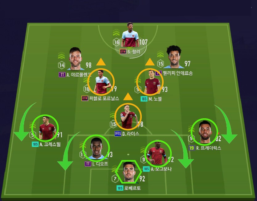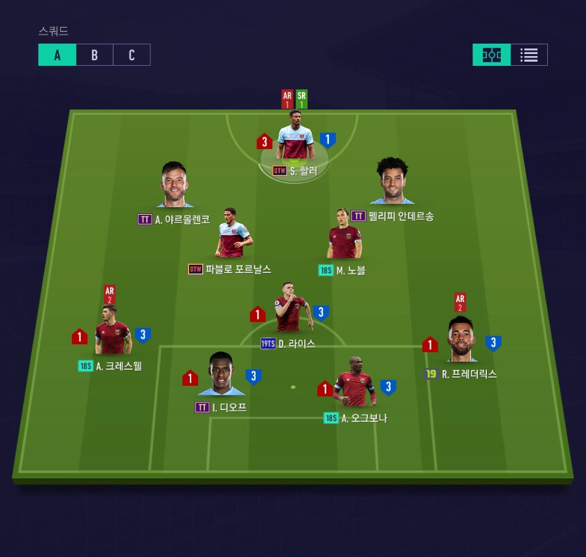 Sơ đồ chiến thuật sử dụng cho West Ham là sơ đồ 4-1-1-1-3 được biến thể từ sơ đồ 4-1-2-3. Tiền đạo cắm ST được hỗ trợ bởi 2 tiền đạo LF,RF thay vì LW,RW.