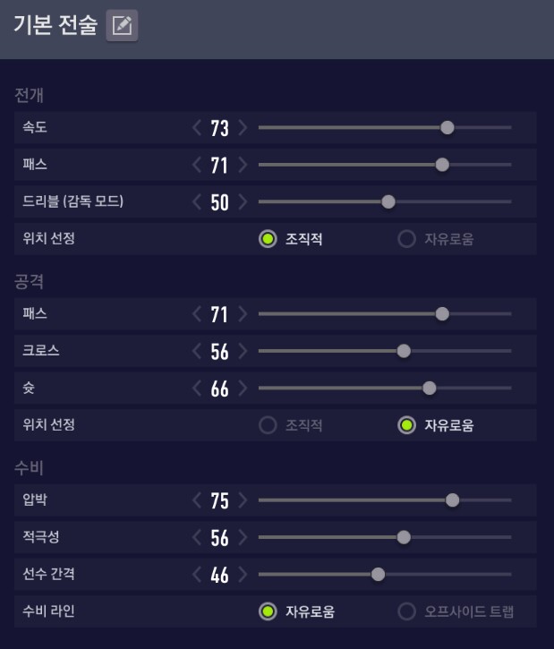 Thiết lập AR1 và SR1 cho tiền đạo cắm ST cùng xu hướng 3-1. 2 vị trí LF,RF và 3 tiền vệ để lối chơi tự do, không có thiết lập nào. Chỉ CDM là thiết lập xu hướng 1-3.