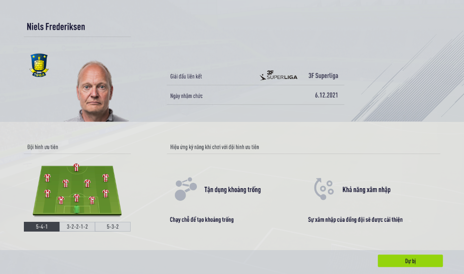 Nếu bạn để ý thì mỗi nhà quản lý sẽ có 3 chiến thuật được ưu tiên buff hiệu ứng. Như ví dụ trong ảnh là Niel Frederiksen với 5-4-1, 3-2-2-1-2 và 5-3-2 đi kèm hiểu ứng là tận dụng khoảng không và khả năng xâm nhập.