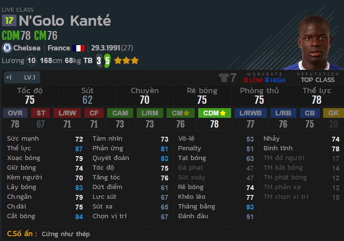 -Sức mạnh: Sở hữu chỉ số sức mạnh chỉ ở mức 72 nhưng đi kèm là chỉ số ẩn CỨNG NHƯ THÉP - Kanté rất trâu và luôn sẵn sàng đánh nhau với bất cứ ai, một phần cũng vì sở hữu trọng tâm thấp nên Kanté rất khó ngã nếu không muốn nói là không bao giờ ngã nếu đối phương tranh chấp hợp lệ. (9,5/10)